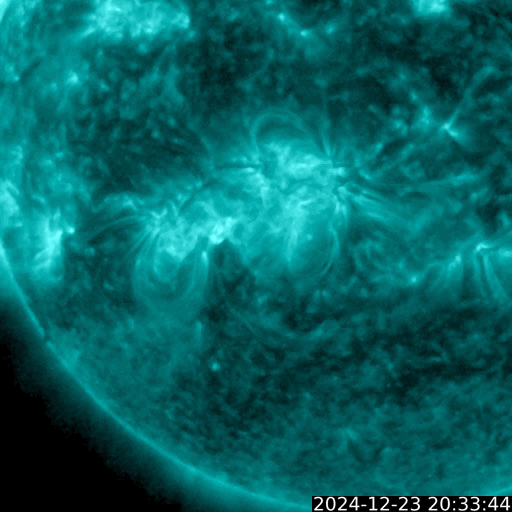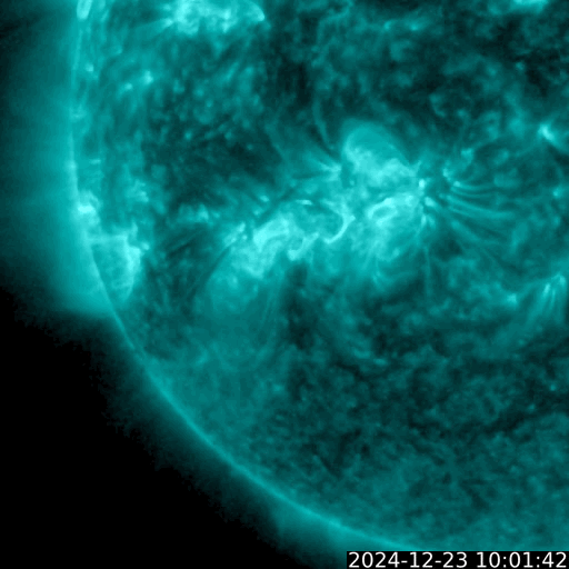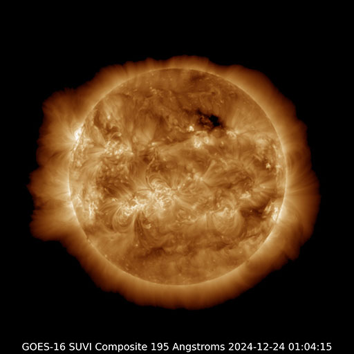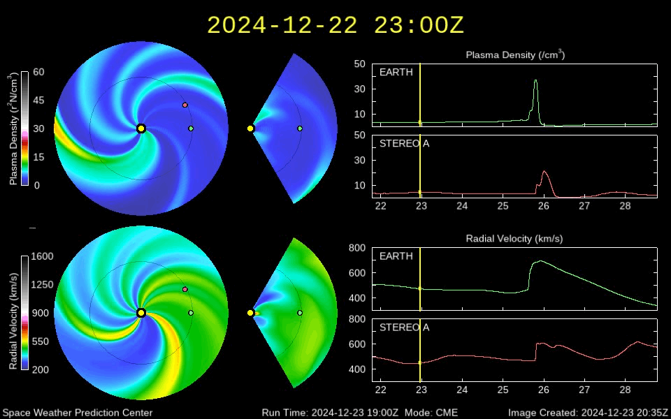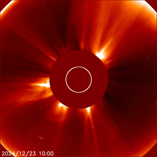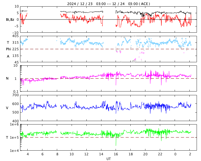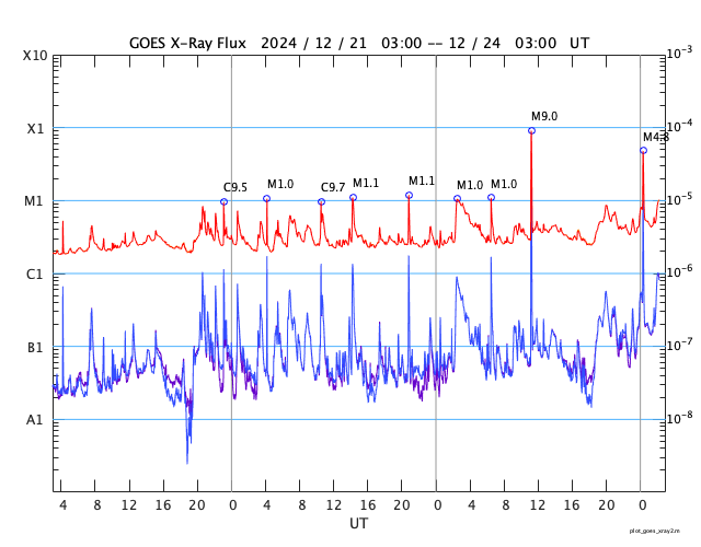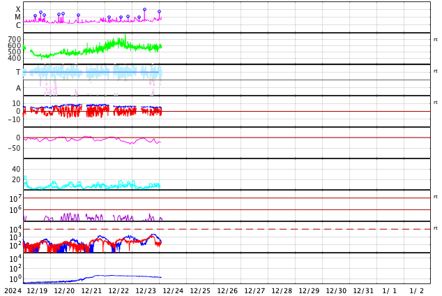 2024/12/24 11:30 更新 M8.9の中規模フレアが発生し、CMEによる太陽風の乱れが到来しそうです。 担当 篠原 昨夜、23日20時(世界時23日11時)に、 太陽の南東(左下)の3932黒点群で、 M8.9と大きめの中規模フレアが発生しました。 GOES衛星SUVI 131と304の動画を掲載します。 赤い画像の304では、 コロナが下に向かって飛び出す様子が見えています。 この規模に達するフレアの発生は、 12月8日のX2.2以来で、2週間ぶりです。 このフレアに伴って、CME(コロナ質量放出)が発生しています。 SOHO衛星LASCO C2、C3の動画を見ると、 コロナのガスは太陽の下寄りに飛び出しています。 地球の方向は噴出の端の方がやって来ることになりそうです。 このため、太陽風の乱れはあまり大きくはなさそうです。 NOAA/SWPCの太陽風予報によると、 太陽風の乱れは、明日の深夜、26日0時(世界時25日15時)頃に 到来する可能性があります。 太陽風の速度が高まって、磁場が南向きに強まると、 磁気圏の活動が激しくなります。 どの程度の磁気圏活動になるか注目して下さい。 3932群では、今朝、24日9時(世界時24日0時)にも M4.7の中規模フレアが発生しています。 GOES衛星SUVI 131の動画を見ると、 周辺の3928群や3933群でもフレアが発生しています。 太陽の中心付近にあるので、引き続き活動に注目して下さい。 太陽風は、550km/秒と高速の状態が続いています。 磁場強度は、7nTから5nTに少し下がっていますが、 平均的な状態です。 磁場の南北成分は、グラフの後半で南寄りになっています。 速度が高まっているため、磁気圏の活動はある程度高まっていて、 AE指数は700nTの中規模の変化が2回発生しています。 現在の高速風はどこまで続くでしょうか。 また、CMEによる乱れはどの程度になるでしょうか。 注目して下さい。 ![]() 3932黒点群で発生したM8.9の中規模フレア。 (c) GOES衛星SUVI 131、304 (NOAA)、(動画加工 : 宇宙天気ニュース) ![]() 太陽の下寄りにCMEが飛び出しています。 (c) SOHO衛星LASCO C2、C3 (ESA & NASA)、(動画加工 : 宇宙天気ニュース) ![]() 太陽風の乱れは、26日0時(世界時25日15時)頃に到来する可能性があります。 (c) NOAA/SWPC ![]() 3932黒点群で発生したM4.7の中規模フレア。 (c) GOES衛星SUVI 131 (NOAA)、(動画加工 : 宇宙天気ニュース) ![]() GOES衛星SUVI 195による太陽コロナの様子。 (c) GOES衛星SUVI 195 (NOAA) ![]() 24日10時(世界時24日1時)に鹿児島で撮影した太陽。 (c) 宇宙天気ニュース ![]() GOES衛星の太陽X線強度。赤・橙 = 0.1〜0.8 nm、青・紫 = 0.05〜0.4 nm (c) データ:NOAA/SWPC、作図:宇宙天気ニュース ![]() ACEが観測した太陽風の磁場(黒線は全体の強度、赤線は南北成分) 磁場の向き、プラズマの密度、速度、温度 (c) データ:NOAA/SWPC、作図:宇宙天気ニュース ![]() AE指数(速報値) 下段のAEグラフの値が高くなると、オーロラ活動が活発化しています。 (c) 京都大学WDC ![]() ![]() 27日の太陽周期に合わせた図 太陽が同じ面を地球に向けていた27日前の変化から、今後を予想することができます。 (c) 作図:宇宙天気ニュース
