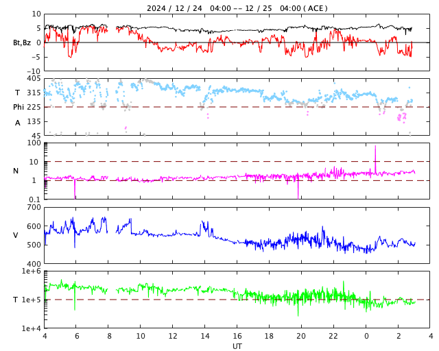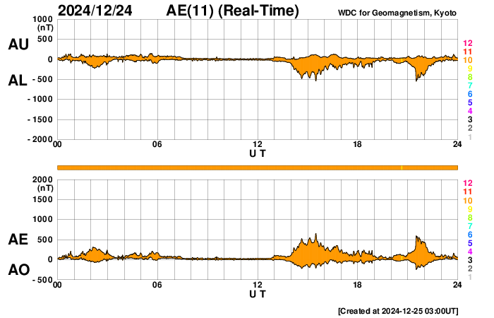2024/12/25 12:17 更新 23日のCMEによる太陽風の乱れが近付いています。アイスランドのオーロラをどうぞ。 担当 篠原 アイスランドに滞在中の藤井哲也さんより、 12月22日に続いて、23日に撮影されたオーロラの写真をいただきました。 掲載枚数の関係で、数回に分けて紹介します。 今日の写真は、東の低空を撮影しています。 ふたご座の頭の2つの星がオーロラに重なっています。 また、2枚目以降は右側にオリオン座の上半分が見えています。 およそ15分間のオーロラの動きになっています。 オレンジ色に近いまっすぐなオーロラの光がの動きが とても印象的だったとのことです。 厳しい寒さだけでなく、現地は強風の警報が出ていて、 車を風よけにしてかろうじて撮影できたとのことです。 この頃の太陽風は、550km/秒と高速で、 磁場が、-5nT程度の南向きの変化をしていました。 AE指数は、400nTの小規模の変化が発生した頃でした。 撮影直後に送っていただいたのですが、掲載が遅れてしまいました。 明日以降、続きの写真を紹介します。 現在の太陽風は、今日に入る頃に、 速度が550km/秒から500km/秒へ少し下がっています。 現在も高速の状態は続いています。 磁場強度は、5nTと平均的な状態です。 磁場の南北成分は、南を向いたり北を向いたりしていて、 南向きになった頃に磁気圏の活動が高まって、 AE指数では、500nTの中規模の変化が発生しています。 23日夜に発生したM8.9の中規模フレアに関係する太陽風の乱れが、 今夜以降、地球に到来する可能性があります。 CME(コロナ質量放出)は太陽の下寄りに広がっていたので、 CMEの端の方が地球にやって来ることになりそうです。 どの程度の変化になるか、注目して下さい。 太陽は、中心部南東側(左下)の3932黒点群で、 M4.1、M1.1、M1.3、M1.0と 中規模フレアの発生が続いています。 また、中心部の3933群でも、 C8.9、C8.5などの小規模フレアが発生しています。 どちらも太陽の中心に近いので、 CMEが発生した場合は影響が及びやすくなります。 引き続き注目してください。 ![]() アイスランド北東部のミーヴァトン湖畔で、現地12月23日19時42分(世界時と同じ)に撮影されたオーロラ。 (c) 藤井哲也氏 ![]() アイスランド北東部のミーヴァトン湖畔で、現地12月23日19時48分(世界時と同じ)に撮影されたオーロラ。 (c) 藤井哲也氏 ![]() アイスランド北東部のミーヴァトン湖畔で、現地12月23日19時51分(世界時と同じ)に撮影されたオーロラ。 (c) 藤井哲也氏 ![]() アイスランド北東部のミーヴァトン湖畔で、現地12月23日19時56分(世界時と同じ)に撮影されたオーロラ。 (c) 藤井哲也氏 ![]() GOES衛星SUVI 195による太陽コロナの様子。 (c) GOES衛星SUVI 195 (NOAA) ![]() 25日9時半(世界時25日0時半)に鹿児島で撮影した太陽。 (c) 宇宙天気ニュース ![]() ACEが観測した太陽風の磁場(黒線は全体の強度、赤線は南北成分) 磁場の向き、プラズマの密度、速度、温度 (c) データ:NOAA/SWPC、作図:宇宙天気ニュース ![]() AE指数(速報値) 下段のAEグラフの値が高くなると、オーロラ活動が活発化しています。 (c) 京都大学WDC ![]() ![]() 27日の太陽周期に合わせた図 太陽が同じ面を地球に向けていた27日前の変化から、今後を予想することができます。 (c) 作図:宇宙天気ニュース
