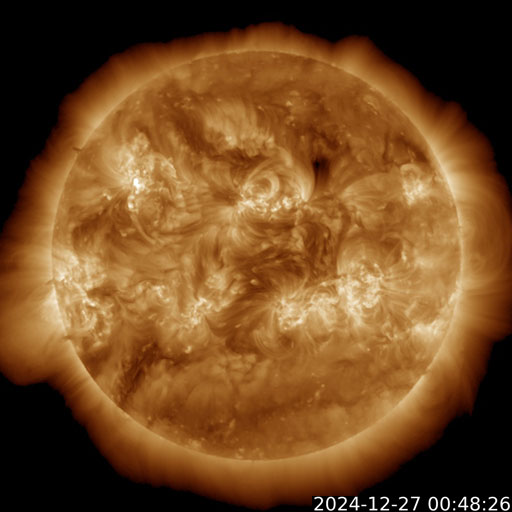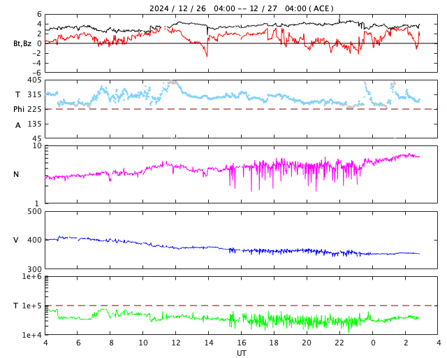 2024/12/27 12:04 更新 太陽風は速度が下がり、低速になっています。アイスランドのオーロラをどうぞ。 担当 篠原 藤井哲也さんによる、 アイスランドのオーロラ写真を紹介します。 昨日、一昨日の写真と同じ、23日夜に撮影されたオーロラです。 今日は魚眼レンズによる全天の写真ですが、 空を大きくまたいで、オーロラの光の帯が複雑に広がっています。 昨日の写真の約30分後の撮影ですが、 23日のAE指数を見ると、 今日の写真の時間帯にかけて値が次第に大きくなっています。 アイスランドの空でも、 この時間帯にかけてオーロラが次第に強まっていた様です。 太陽風は、速度が400km/秒から350km/秒へゆっくりと下がり、 低速の風に変わっています。 磁場強度は、3〜4nTとやや弱い状態です。 注目していたCME(コロナ質量放出)による太陽風の乱れは、 今のところ到来していません。 速度があまり高まっていなくて、到来が遅れているのかもしれません。 もうしばらく注目して下さい。 太陽風磁場の南北成分は、0nT付近か弱い北寄りです。 磁気圏は穏やかで、AE指数はほとんど変化のない状態です。 太陽は、昨日の2つのMフレアの後は 活動が少なくなりましたが、 今日未明、27日3時半(世界時26日18時半)に、 南東の端近く(左下)の領域でC9.6、 今朝、27日9時半(世界時27日0時半)に、 北東(左上)の3938黒点群でC9.0と、 大きめの小規模フレアが発生しています。