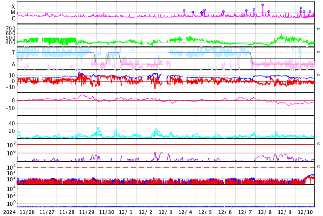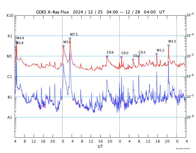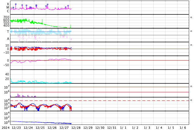 GOES衛星の太陽X線強度。赤・橙 = 0.1〜0.8 nm、青・紫 = 0.05〜0.4 nm (c) データ:NOAA/SWPC、作図:宇宙天気ニュース ![]() | |||||||||||||||||||||||||||||||||||||||||||||||||||||||||||||||||||||||||||||||||||||||||||||||||||||||||||||||||||||||||||||||||||||||||||||||||||||||||||||||||||||||||||||||||||||||||||||||||||||||||||||||||||||||||||||||||||||||||||||||||||||||||||||||||||||||||||||||||||||||||||||||||||||||||||||||||||||||||||