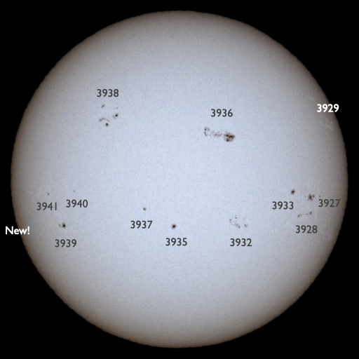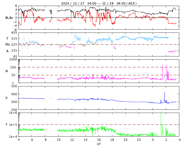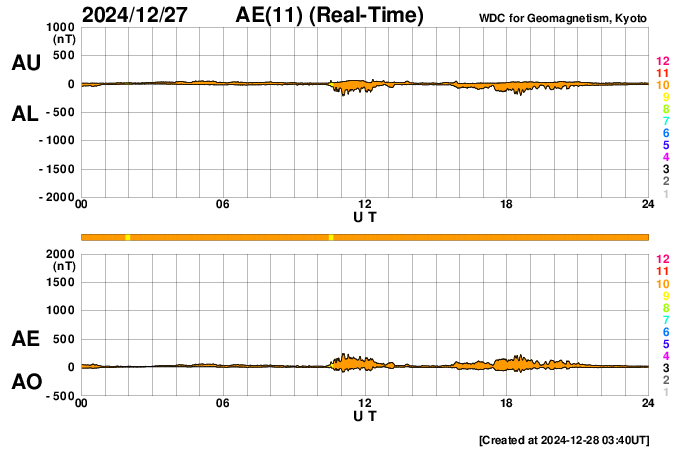 2024/12/28 12:46 更新 太陽風はより低速になっています。アイスランドのオーロラをどうぞ。 担当 篠原 アイスランドに滞在中の藤井哲也さんからいただいた 現地24日夜のオーロラ写真を紹介します。 本当は撮影直後に送っていただいたのですが、 こちらの事情で掲載が今日になっています。 太陽風の速度は550km/秒から500km/秒に少し下がった頃ですが、 高速の状態は続いていて、 1枚目の頃は磁場が南向きに変化して、 AE指数は600nTと中規模の変化が起きていました。 広角レンズで南西から北東にかけて雄大なオーロラの姿を捉えています。 写真の左端にはペガスス座の四辺形が、 右端には北斗七星が写っています。 2枚目は30分後の撮影で、 太陽風の磁場が北向きに変わり、AE指数の変化が小さくなった頃です。 オーロラの光はだいぶ弱くなっていますが、 光の筋が何本も美しく伸びています。 北東の空を写していて、左上に北斗七星が、 右下にはこいぬ座のプロキオンが見えています。 オーロラの光の筋のすぐ右には、 かに座のプレセペ星団が小さく見えています。 そのすぐ上の赤い星は火星です。 活動度の強弱で空の見え方が変わる様子が良く分かります。 きれいな写真をどうもありがとうございます。 現在の太陽風は、速度が350km/秒から300km/秒へ下がり、 より低速の風になっています。 磁場強度は2〜4nTで推移していて、やや弱い状態です。 太陽風は穏やかな状態が続いていて、 CME(コロナ質量放出)による太陽風の乱れは、 はっきり分かるレベルでは到来しませんでした。 磁気圏は基本的には穏やかで、 AE指数は、磁場が南向きになった頃に 小さい変化が発生するくらいです。 GOES衛星SUVI 195の太陽コロナ写真では、 コロナホールは特に見えていません。 太陽風は穏やかに推移しそうです。 太陽は、可視光写真を見ると、 南半球側で黒点群が西から東まで並んでいて、 にぎやかな状態です。 WDC-SILSOの黒点相対数の速報値を見ると、 26日は267、27日は258に高まっています。 時期的に考えると、 第25期最後の高まりになる可能性もあります。 しっかり味わって下さい。 フレアは、南西(右下)の3928黒点群でM1.2、 北東(左上)の3938群でM3.3の中規模フレアが発生し、 南東(左下)の3941群でC6.7、 中心部南西側の3932群でC9.5の小規模フレアなど、 あちこちで発生しています。 今のところ活発という印象ではありませんが、 今後はどの様に推移するでしょうか。