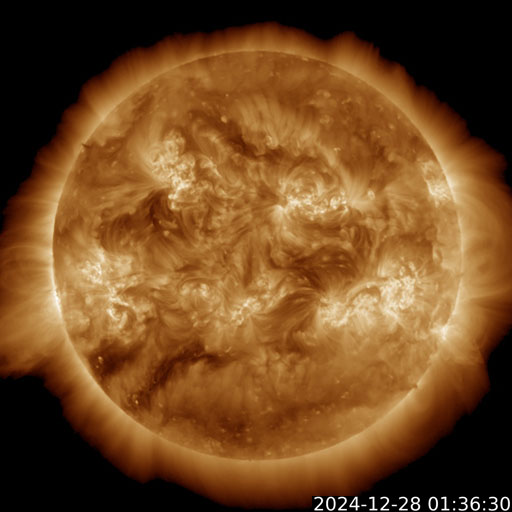 (c) 藤井哲也氏 ![]() アイスランド北東部のミーヴァトン湖畔で、現地12月24日22時21分(世界時と同じ)に撮影されたオーロラ。 (c) 藤井哲也氏 ![]() GOES衛星SUVI 195による太陽コロナの様子。 (c) GOES衛星SUVI 195 (NOAA) ![]() 28日10時半(世界時28日1時半)に鹿児島で撮影した太陽。 (c) 宇宙天気ニュース ![]() ACEが観測した太陽風の磁場(黒線は全体の強度、赤線は南北成分) 磁場の向き、プラズマの密度、速度、温度 (c) データ:NOAA/SWPC、作図:宇宙天気ニュース ![]() AE指数(速報値) 下段のAEグラフの値が高くなると、オーロラ活動が活発化しています。 (c) 京都大学WDC ![]() ![]() 27日の太陽周期に合わせた図 太陽が同じ面を地球に向けていた27日前の変化から、今後を予想することができます。 (c) 作図:宇宙天気ニュース