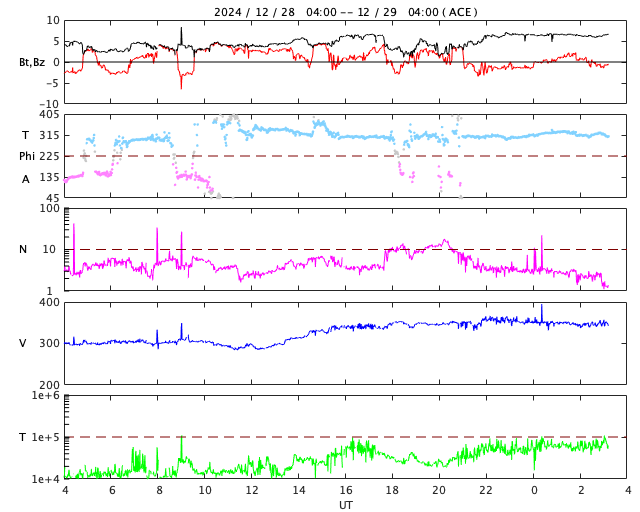 2024/12/29 12:21 更新 太陽風は低速で、磁気圏も穏やかです。アイスランドのオーロラをどうぞ。 担当 篠原 アイスランドに滞在中の藤井哲也さんからお送りいただいた オーロラ写真の続きを紹介します。 1枚目は昨日紹介した写真の少し後、現地24日の深夜です。 太陽風の磁場が弱い北寄りになり、 オーロラの活動が静かになった頃の写真です。 オーロラの光は弱くなっていますが、 右上から左下に斜めに伸びる天の川ときれいに交差しています。 天の川は、右上の端で夏の星座のはくちょう座、 中央付近でカシオペヤ座、ペルセウス座と秋の星座を通り、 左下で冬のオリオン座の左横を流れています。 すごく素敵な雰囲気の写真です。 2枚目は、アイスランドの南西部に移動しての撮影です。 現地28日1時39分のオーロラですが、 昨日のニュースでこの頃のデータを見ると、 太陽風は300km/秒に速度が下がり、磁場の南北成分は0nT付近で、 磁気圏はとても穏やかでした。 AE指数は全く変化していません。 写真のオーロラも北の空に低く、穏やかに感じます。 オーロラの光の右寄りに明るく見える星はこと座のベガです。 この星が北の低い空で見えているのは、高緯度地域だからこそです。 様々な条件でのオーロラの写真はとても参考になります。 どうもありがとうございます。 太陽風は、速度が300km/秒から350km/秒へ少し上がっています。 低速の状態は続いています。 磁場強度は、3nTから7nTへ少し上がっています。 磁場の南北成分は、0nT付近かやや北寄りです。 磁気圏は穏やかで、 AE指数は変化の少ない状態が続いています。 太陽では、昨夜、29日20時(世界時28日11時)に、 南西(右下)の3932黒点群でM4.5の中規模フレアが発生しました。 GOES衛星SUVI 131の動画を掲載します。 3932群では、この後もM1.3の中規模フレアが発生しています。 この後、福岡へ帰省します。 望遠鏡を持って行き、撮影は続けたいと考えていますが、 日本海側のため冬は天気が悪いことが多いので、 掲載できない日が多くなりそうです。 ![]() アイスランド北東部のミーヴァトン湖畔で、現地12月24日23時26分(世界時と同じ)に撮影されたオーロラ。 (c) 藤井哲也氏 ![]() アイスランド南西部のシンクバトラ湖畔で、現地12月28日1時39分(世界時と同じ)に撮影されたオーロラ。 (c) 藤井哲也氏 ![]() 3932黒点群で発生した、M4.5の中規模フレア。 (c) GOES衛星SUVI 131 (NOAA)、(動画加工 : 宇宙天気ニュース) ![]() GOES衛星SUVI 195による太陽コロナの様子。 (c) GOES衛星SUVI 195 (NOAA) ![]() 29日9時半(世界時29日0時半)に鹿児島で撮影した太陽。 (c) 宇宙天気ニュース ![]() ACEが観測した太陽風の磁場(黒線は全体の強度、赤線は南北成分) 磁場の向き、プラズマの密度、速度、温度 (c) データ:NOAA/SWPC、作図:宇宙天気ニュース ![]() AE指数(速報値) 下段のAEグラフの値が高くなると、オーロラ活動が活発化しています。 (c) 京都大学WDC ![]() ![]() 27日の太陽周期に合わせた図 太陽が同じ面を地球に向けていた27日前の変化から、今後を予想することができます。 (c) 作図:宇宙天気ニュース