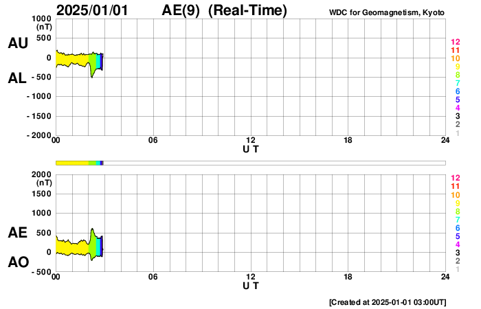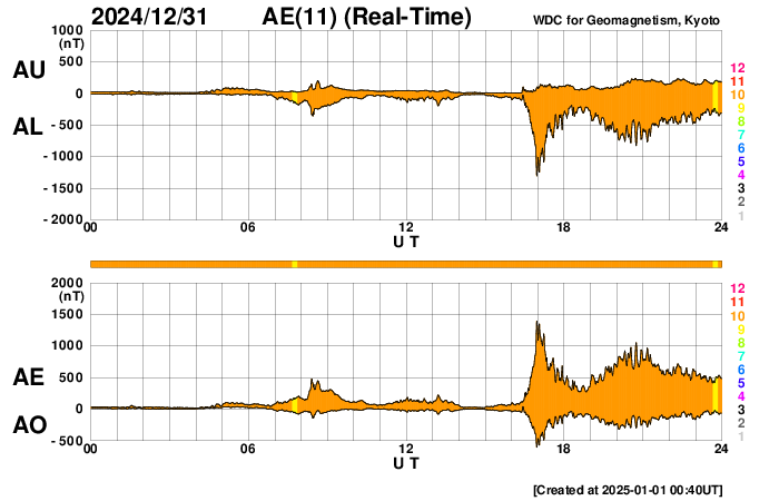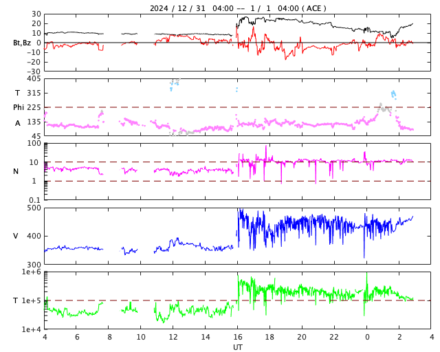 2025/ 1/ 1 12:04 更新 CMEによる太陽風の乱れが到来しました。アイスランドのオーロラをどうぞ(12月29日のオーロラです)。 担当 篠原 明けましておめでとうございます。 2025年も宇宙天気ニュースをよろしくお願い致します。 今年は太陽活動が低下に向かい始めるかもしれません。 黒点数やフレアの長期的な推移に注目して下さい。 アイスランドに滞在している藤井哲也さんからいただいた、 12月29日未明のオーロラ写真を紹介します。 この頃の太陽風は、速度は350km/秒と低速で磁気圏の活動は低調でした。 藤井さんによるとオーロラのレベルは低い状態が続いていたものの、 晴れていて北斗七星がきれいに見えていたので、 車の中で3時間程待っていたそうです。 すると、掲載の写真の様なオーロラの輝きが発生したとのことです。 太陽風のデータを見ると、この少し前から磁場が弱い南向きになっていたので、 その影響でオーロラの強まりが見られたのかもしれません。 ただし、AE指数では小さい変化しか記録されていないので、 小規模の活動をその地域で見ることができたのかもしれません。 どうもありがとうございます。 現在のアイスランドは、素晴らしい夜になっているかもしれません。 注目していたCME(コロナ質量放出)による太陽風の乱れが、 今日未明、1日1時(世界時31日16時)にACE衛星で観測されました。 速度は360km/秒から450km/秒と、 低速から平均的な速度に上がった程度でしたが、 磁場強度は、8nTから25nTとしっかり強まっています。 磁場の南北成分は、-5〜-10nT程度の南寄りの変化が6時間程続きました。 このため、磁気圏の活動はある程度強まって、 AE指数は、最初に1400nTの大きい変化が発生して、 その後は、500〜1000nTの中規模の変化がしばらく続いています。 磁場の南北成分は、現在は0nT付近と変化が小さくなっていて、 磁気圏の活動は弱くなっています。 磁場強度は15nT前後で推移しているので、 再び南向きに傾向が変わると、磁気圏の活動も強まるでしょう。 そして、今夜、2つめのCMEによる太陽風の乱れが到来する可能性があります。 NOAA/SWPCの予報では、1日19時(世界時1日10時)頃と考えられています。 引き続き注目してください。 太陽は、フレアの発生は少なくなっていますが、 今朝、1日7時(世界時31日22時)に、 北西の端(右上)の3936黒点群でM2.7、 直後の1日8時(世界時31日23時)に、 その左側の3938群でM2.9の中規模フレアが発生しています。