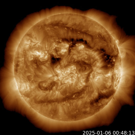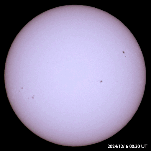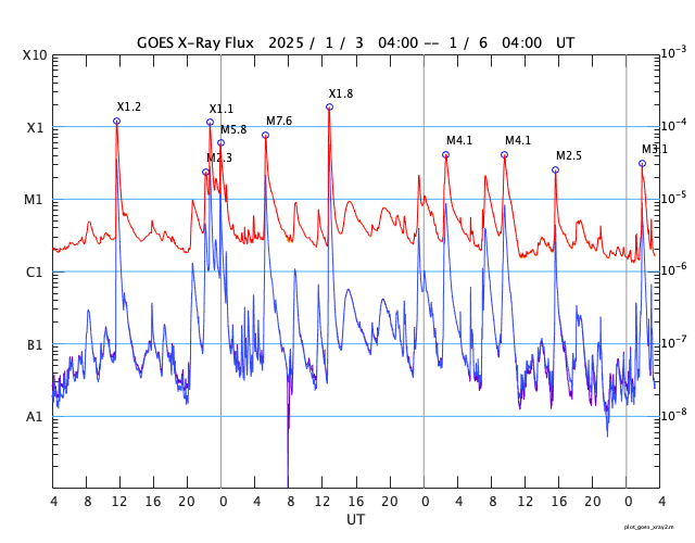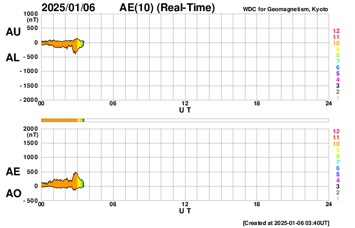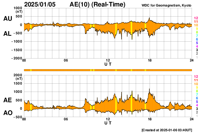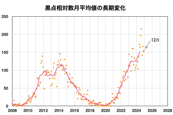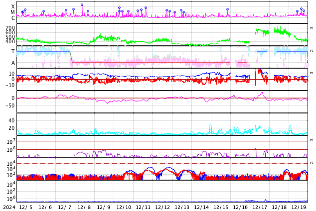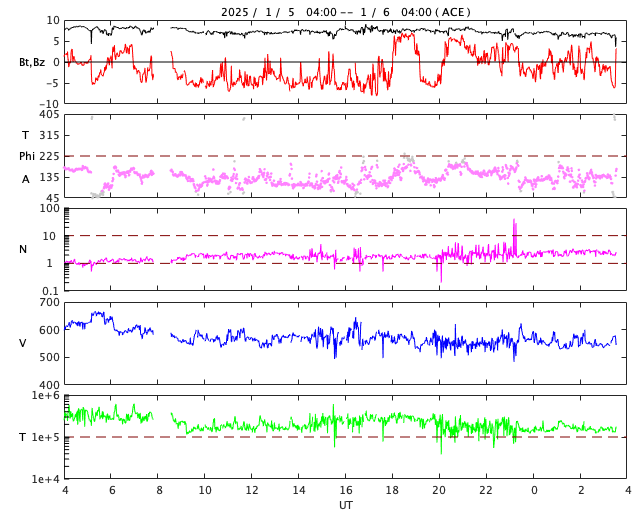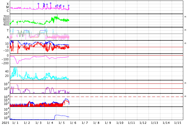 2025/ 1/ 6 12:41 更新 高速の太陽風が続き、磁気圏の活動も高まっています。12月の黒点相対数は 154.5 でした。 担当 篠原 WDC-SILSO より、12月の黒点相対数月平均値は、 154.5 と発表されました。 11月の152.5とほぼ同じで、9月以降は150前後の状態が続いています。 一方、1日値を見ると、26日から28日にかけて、 259、258、252と高い値が続きました。 1日値が250を超えたのは8月9日の264以来で、4か月半ぶりです。 2019年12月に第25期が始まって、5年が経過しました。 1枚目の図で第24期と比べると、 今年は2014年の変化に相当することになります。 太陽活動は極大を過ぎて、低下が始まる可能性があります。 長い視点で注目を続けて下さい。 太陽では、北東(左上)の3947黒点群でフレアが続いています。 5日16時(世界時5日7時)にM2.1、 5日18時(世界時5日9時)にM4.1、 6日0時半(世界時5日15時半)にM2.4、 そして、6日10時半(世界時6日1時半)にM3.1と、 中規模フレアが発生しています。 最後のM3.1フレアの動画を掲載します。 3947群では、これまでのフレアでは、 目立つ規模のCME(コロナ質量放出)は発生していませんが、 これから太陽の中心に近付くので。 CMEを伴う場合は、影響が及びやすくなります。 太陽風は、600km/秒から一段下がりましたが、 550km/秒と高速の状態が続いています。 磁場強度は、7nT付近で安定しています。 GOES衛星SUVI 195の太陽コロナ写真を見ると、 西側(右側)にだいぶ進みましたが、 コロナホールの影響が続いている様です。 太陽風磁場の南北成分は、 グラフの中盤で -5nT程度の南寄りの状態が続いています。 ここで磁気圏の活動も強まって、 AE指数では500〜1000nTの中規模の変化が 連続的に発生しています。 その後、磁場は0nT付近で南北に変化する様になり、 磁気圏活動の規模も下がって、 AE指数は小規模の変化に変わっています。 高速太陽風はどこまで続くでしょうか。