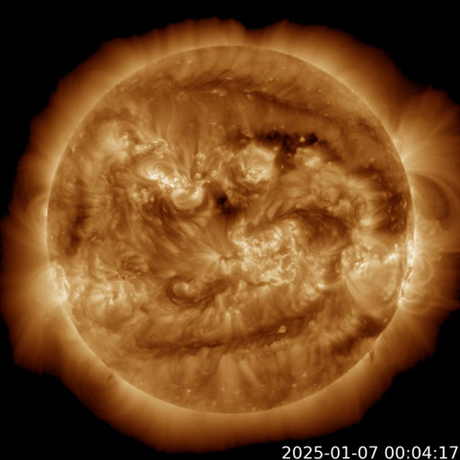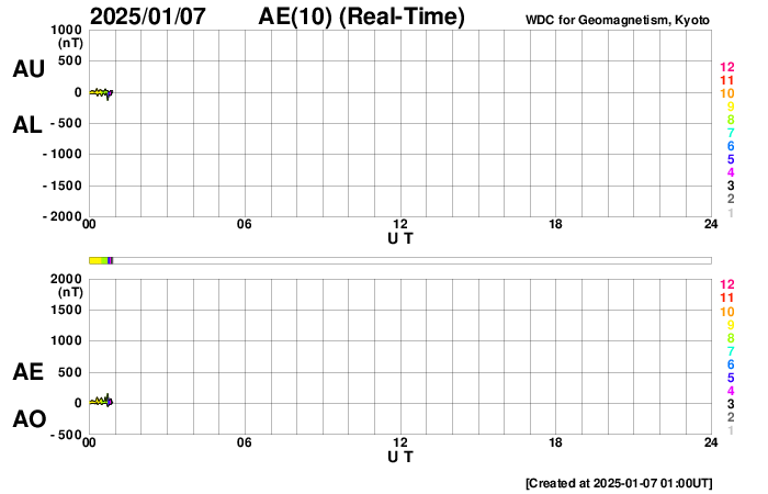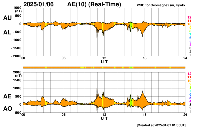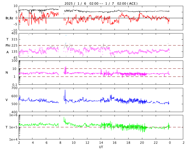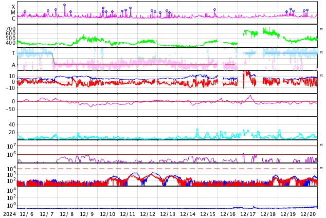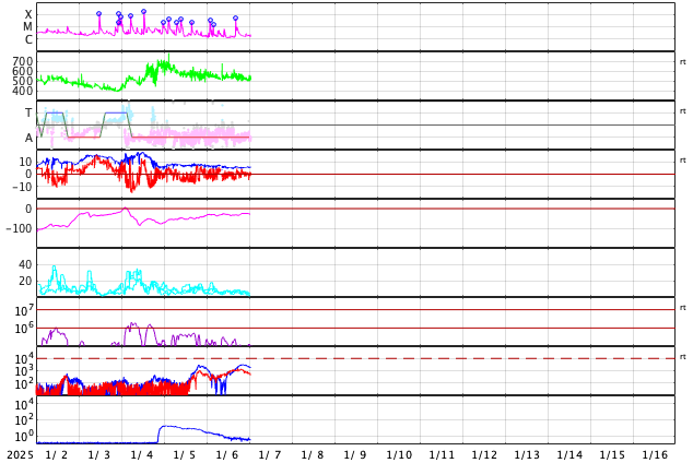 2025/ 1/ 7 10:13 更新 太陽風は高速の状態が続いています。1日深夜の美ヶ原高原の低緯度オーロラをどうぞ。 担当 篠原 池田吉則さんより、1日の深夜に長野県の美ヶ原高原で撮影された 低緯度オーロラの写真をお送りいただきました。 この日は、天候が良さそうだったので23時頃から撮影を行っていたところ 北極星方面を撮影した時に、 カメラモニターでピンク色がはっきり確認できたので、 低緯度オーロラではないかと考えて、 場所や時間を変えて撮影を続けたとのことです。 2日のニュースで紹介しましたが、 ちょうどこの頃に北海道など各地で低緯度オーロラが観測されていて、 私も銀河の森天文台のライブ中継を見ていたところです。 写真を見ると、カシオペヤ座と北極星の間の地平線近くに、 赤い光がきれいに写っています。 一面の雪原の上で本当にきれいな写真になっています。 貴重な情報をありがとうございます。 太陽風は、速度が550km/秒から500km/秒へ少し下がっています。 高速の状態は続いていますが、勢いは次第に弱まっています。 磁場強度は、6nTと平均的な状態です。 磁場の南北成分は、0nT付近で南北に変化しています。 速度の高まりもあり、磁気圏の活動は続いていて、 AE指数では、500〜1000nT程度の中規模の変化が発生しています。 GOES衛星SUVI 195の太陽コロナ写真では、 コロナホールは西に進み、はっきりとは見えなくなっています。 この後、太陽風の速度は低下に向かいそうです。 太陽は、中心部北東(左上)の3947黒点群で、 今日未明、7日1時(世界時6日16時)に M4.8の中規模フレアが発生しています。 GOES衛星SUVI 131の動画を掲載します。 X線グラフを見ると、変化がやや少なくなっています。 このまま穏やかになるのか、 しばらく経って再び活動が強まるのか、 引き続き注目してください。