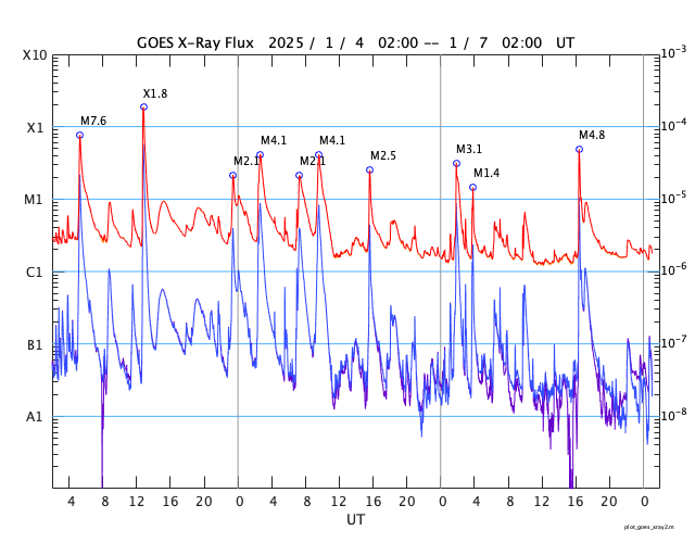 GOES衛星の太陽X線強度。赤・橙 = 0.1〜0.8 nm、青・紫 = 0.05〜0.4 nm (c) データ:NOAA/SWPC、作図:宇宙天気ニュース ![]() | ||||||||||||||||||||||||||||||||||||||||||||||||||||||||||||||||||||||||||||||||||||||||||||||||||||||||||||||||||||||||||||||||||||||||||||||||||||||||||||||||||||||||||||||||||||||||||||||||||||||||||||||||||||||||||||||||||||||||||||||||||||||||||||||||||||||||||||||||||||||||||||||||||||||||||||||||||||