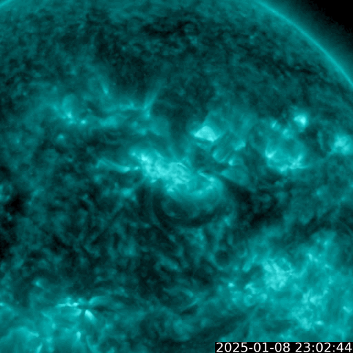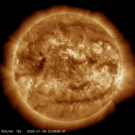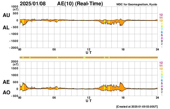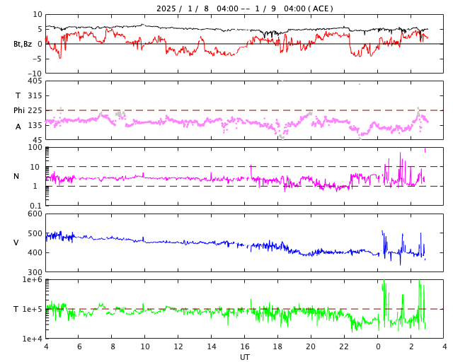2025/ 1/ 9 12:12 更新 太陽風は平均的な速度に戻っています。 担当 篠原 太陽風の速度は、昨日のニュース以降ゆっくりと低下して、 今朝早く、9日4時(世界時8日19時)頃には、 400lkm/秒まで下がりました。 現在もこの状態で、平均的な速度が続いています。 磁場強度は5nTと、こちらも平均的な状態です。 太陽風磁場の南北成分は、 北寄りになったり、南寄りになったり、 ゆっくり変化しています。 南寄りになった頃に磁気圏の活動がやや高まって、 AE指数では300〜500nTの小規模の変化が発生しています。 その他の時間帯は変化はなく、磁気圏は穏やかです。 SDO衛星の画像の更新が部分的に回復していて、 今日は、太陽コロナ写真としてSDO衛星AIA193を掲載しています。 昨年の11月27日以来です。 目立つ規模のコロナホールはなく、 この後の太陽風は、穏やかな状態がしばらく続きそうです。 SDO衛星の太陽可視光写真はまだ更新されていないので、 鹿児島で撮影した画像を掲載しています。 (今日が最後の撮影になるかもしれません) 中心部北西側(右上)の3947黒点群で、 今朝、9日9時半(世界時9日0時半)に M1.1の中規模フレアが発生しました。 GOES衛星SUVI 131の動画を掲載します。 3947群では2日半ぶりのMクラスフレアです。 可視光写真では、東側(左側)は黒点が少なくなっています。 今後、フレアなどの活動は少なくなるかもしれません。 ![]() 3947黒点群で発生した、M1.1の中規模フレア。 (c) GOES衛星SUVI 131 (NOAA)、(動画加工 : 宇宙天気ニュース) ![]() 9日10時半(世界時9日1時半)に鹿児島で撮影した太陽。 (c) 宇宙天気ニュース ![]() SDO衛星のAIA193カメラによる太陽コロナの様子 (c) SDO (NASA) ![]() ACEが観測した太陽風の磁場(黒線は全体の強度、赤線は南北成分) 磁場の向き、プラズマの密度、速度、温度 (c) データ:NOAA/SWPC、作図:宇宙天気ニュース ![]() AE指数(速報値) 下段のAEグラフの値が高くなると、オーロラ活動が活発化しています。 (c) 京都大学WDC ![]() ![]() 27日の太陽周期に合わせた図 太陽が同じ面を地球に向けていた27日前の変化から、今後を予想することができます。 (c) 作図:宇宙天気ニュース
