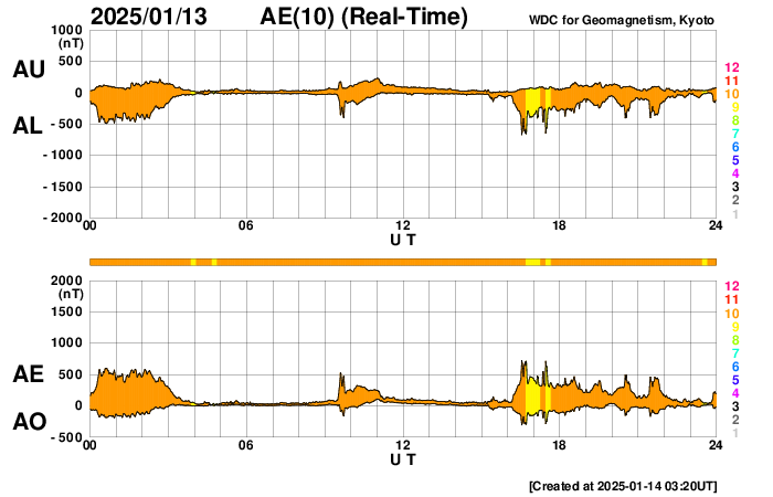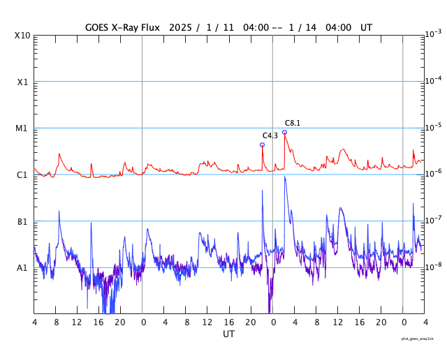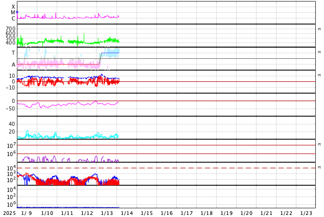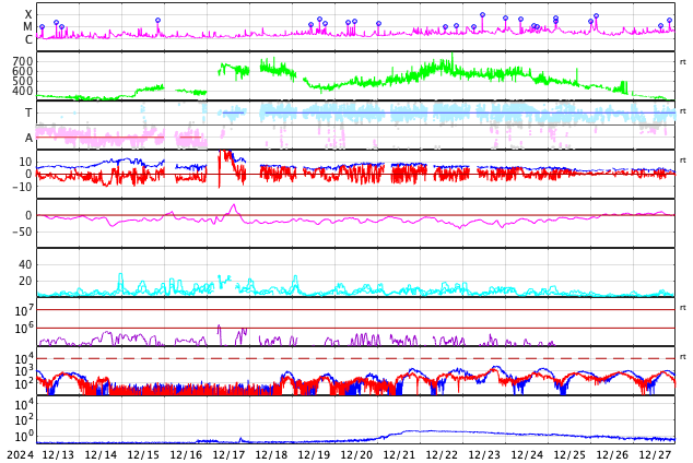 GOES衛星の太陽X線強度。赤・橙 = 0.1〜0.8 nm、青・紫 = 0.05〜0.4 nm (c) データ:NOAA/SWPC、作図:宇宙天気ニュース ![]() | ||||||||||||||||||||||||||||||||||||||||||||||||||||||||||||||||||||||||||||||||||||||||||||||||||||||||||||||||||||||||||||||||||||||||||||||||||||||||||||||||||||||||||||||||||||||||||||||||||||||||||||||||||||||||||||||||||||||||||||
