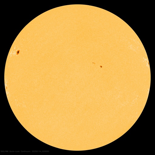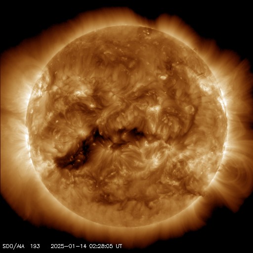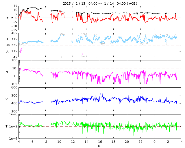 2025/ 1/14 12:34 更新 太陽風は平均的な状態です。アトラス彗星が大きく見えています。 担当 篠原 SOHO衛星LASCO C3の画面をアトラス彗星が通過中です。 尾が大きく広がって、見応えがあります。 写っているのは明日まででしょうか。 太陽風は、速度が400km/秒から450km/秒へ少し上がり、 その後、400km/秒近くに下がっています。 平均的な状態が続いています。 磁場強度は、グラフの初めに13nTの強まりが発生していますが、 すぐに下がり、今日に入る頃からは6nTと平均的な値に戻っています。 磁場の南北成分は、南北へ小幅の変化が見られ、 AE指数では、500nTに達するくらいの活動が発生しています。 SDO衛星AIA193の太陽コロナ写真では、 中心付近から南東側(左下)にかけてコロナホールが見えています。 この領域の影響で、 3〜4日後から太陽風の速度が高まるかもしれません。 太陽は、目立ったフレアはなく、 穏やかに推移しています。 可視光写真を見ても、中心付近は黒点が少なくなっています。 北東の端(左上)の3959黒点群に続いて、 南東の端(左下)に新しい黒点が現れています。 これらの領域で活動は見られるでしょうか。 ![]() LASCO C3の画面を通過するアトラス彗星、 (c) SOHO衛星LASCO C3 (ESA & NASA)、(動画加工 : 宇宙天気ニュース) ![]() SDO衛星のAIA193カメラによる太陽コロナの様子 (c) SDO (NASA) ![]() SDO衛星による太陽の可視光写真。マウスの矢印を写真に重ねると、黒点番号付きの写真に切り替わります。 (c) SDO (NASA) ![]() ACEが観測した太陽風の磁場(黒線は全体の強度、赤線は南北成分) 磁場の向き、プラズマの密度、速度、温度 (c) データ:NOAA/SWPC、作図:宇宙天気ニュース ![]() AE指数(速報値) 下段のAEグラフの値が高くなると、オーロラ活動が活発化しています。 (c) 京都大学WDC ![]() ![]() 27日の太陽周期に合わせた図 太陽が同じ面を地球に向けていた27日前の変化から、今後を予想することができます。 (c) 作図:宇宙天気ニュース