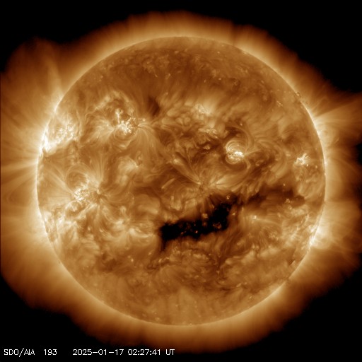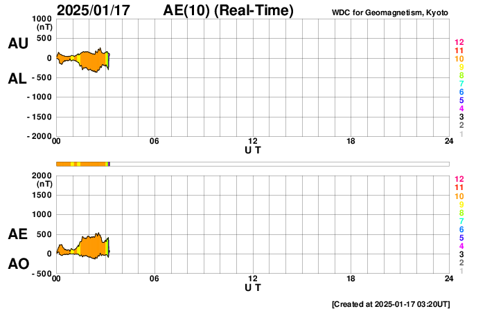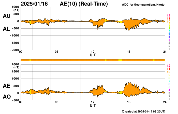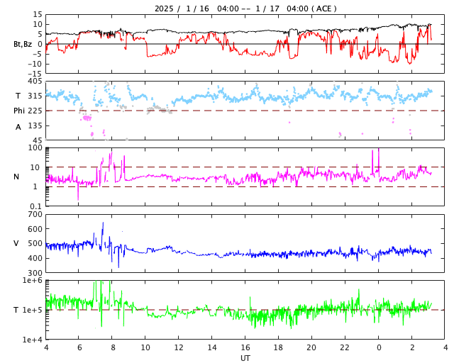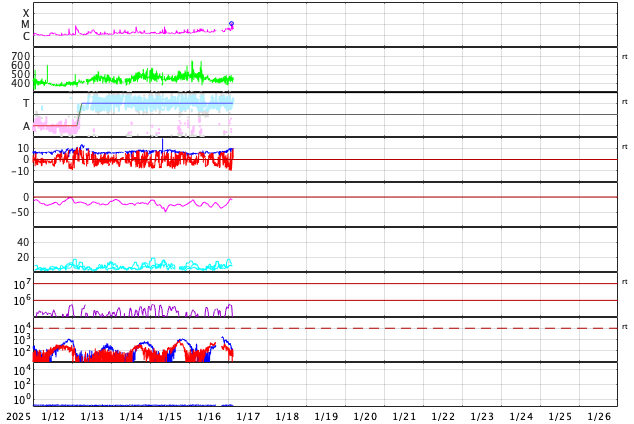 2025/ 1/17 12:25 更新 太陽風は平均的な速度に下がっています。M1.3の中規模フレアが発生しました。 担当 篠原 太陽風の速度は、昨日の夕方に500km/秒を割り、 現在は440km/秒と平均的な速さに戻っています。 磁場強度は、5nTから10nTへゆっくり強まっています。 磁場の南北成分は、 時間をおいて南向きに繰り返し変化しています。 その時に磁気圏の活動も強まって、 AE指数では、500〜750nTの中規模の変化が発生しています。 SDO衛星AIA193の太陽コロナ写真を見ると、 南半球のコロナホールが南西側(右下)に進み、 これから影響が始まりそうです。 速度は一旦下がりましたが、磁場強度が高まっていることもあり、 この後の変化に注目して下さい。 太陽は、中心部北西側(右上)の 3964黒点群の活動が目立つようになっています。 X線グラフの最後、17日10時半(世界時17日1時半)には、 M1.3の中規模フレアが発生しました。 Mクラスの中規模フレアの発生は、 9日のM1.1以来で、1週間ぶりです。 この後の活動に注目して下さい。 昨日も紹介しましたが、 STEREO Ahead衛星HI1の画像が高画質になっていたので、 1月14日のアトラス彗星の動画を紹介します。