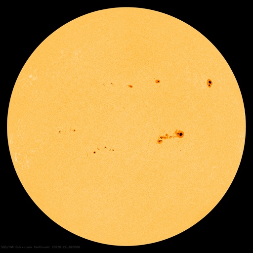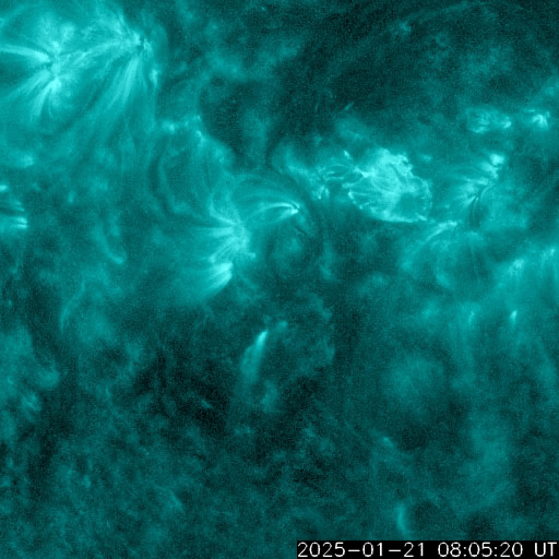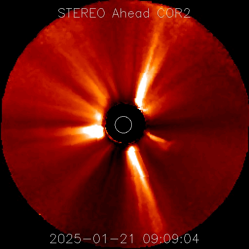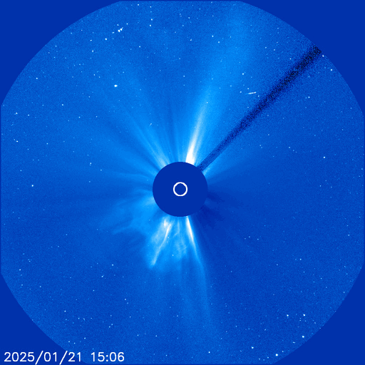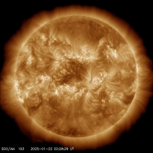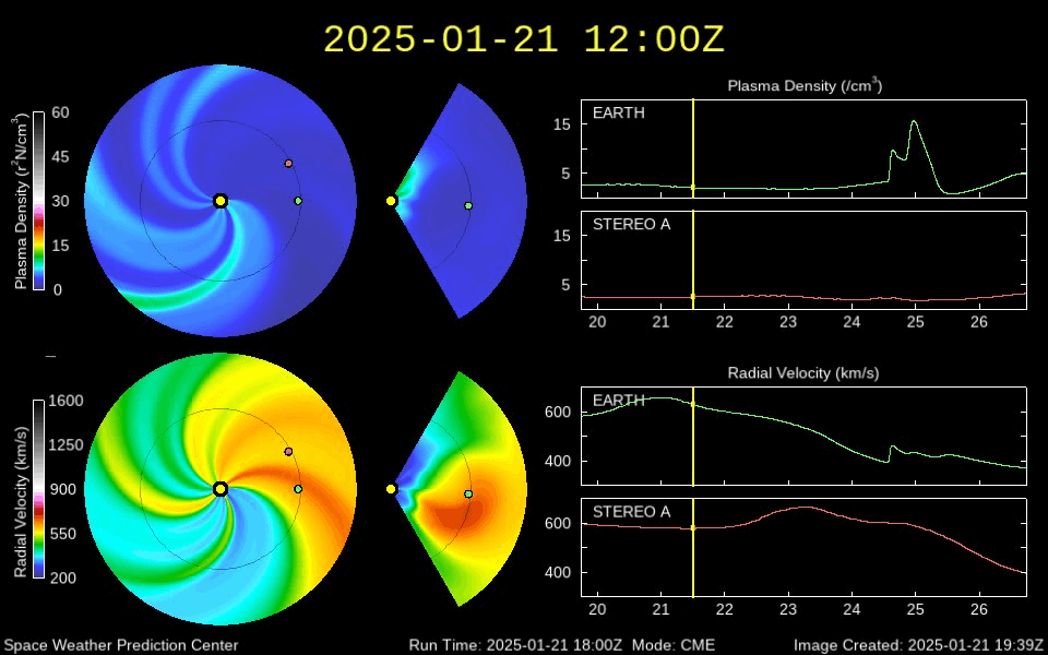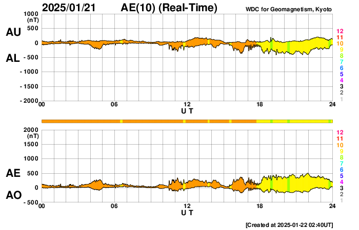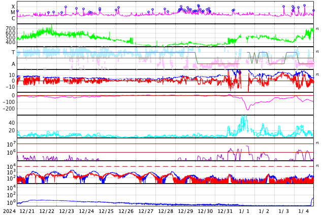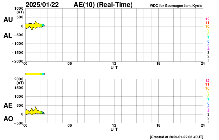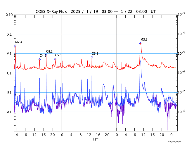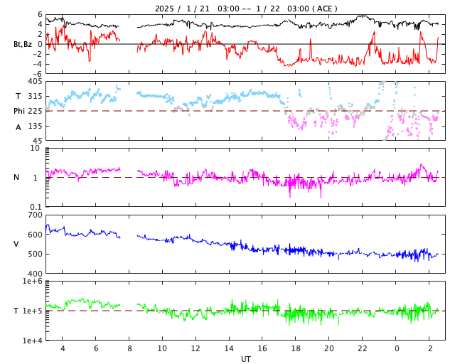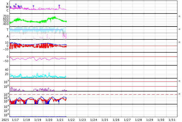 2025/ 1/22 11:41 更新 M3.3の中規模フレアが発生し、CMEによる太陽風の乱れが到来する可能性があります。 担当 篠原 昨夜、21日19時(世界時21日10時)に、 太陽の中心部南東側(左下)の3967黒点群で、 M3.3の中規模フレアが発生しました。 SDO衛星AIA131と193による動画を掲載します。 SDO衛星の動画では、コロナが下寄りに噴出する様子が見えていて、 SOHO衛星LASCO C3によると、 CME(コロナ質量放出)が太陽の左下寄りに飛び出しています (LASCO C2の画像はありませんでした)。 また、太陽を地球よりも30度ほど右側から観測している STEREO Ahead衛星のCOR2でも、 太陽の左下へ飛び出すCMEが見えています。 NOAA/SWPCの太陽風予報によると、 このCMEによる太陽風の乱れは地球にも向かっていて、 明後日の深夜、24日23時(世界時24日14時)頃に 地球に到来する可能性があるとのことです。 この場合、発生から3日後くらいに到来することになり、 太陽風速度の高まりは比較的小規模でしょう。 それでも、磁場の強まりがやって来て南向きに大きく変化すると、 磁気圏の活動は活発になります。 どの様な変化がやって来るのか、注目して下さい。 太陽風は、昨日のニュース以降は速度が次第に低下して、 600km/秒から、現在は500km/秒に下がっています。 高速の状態は続いていますが、 このまま低下すると平均的な速さに戻る事になります。 磁場強度は、4nTと平均的な状態で推移しています。 南北成分は、グラフの中程から南寄りになり、 -3nT前後の状態が続いています。 これにより、磁気圏の活動はやや高まっていて、 AE指数は、グラフの途中から400nTの小規模の変化が 連続するようになっています。 SDO衛星AIA193の太陽コロナ写真では、 全体がぼんやりと光っていて、コロナホールは特に見えていません。