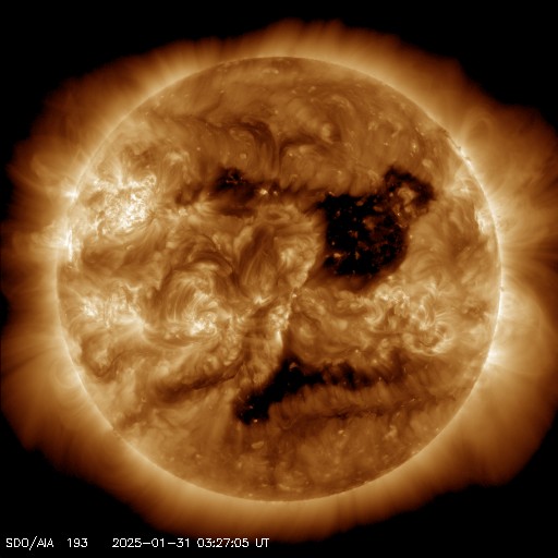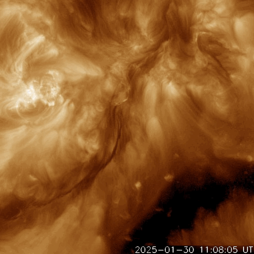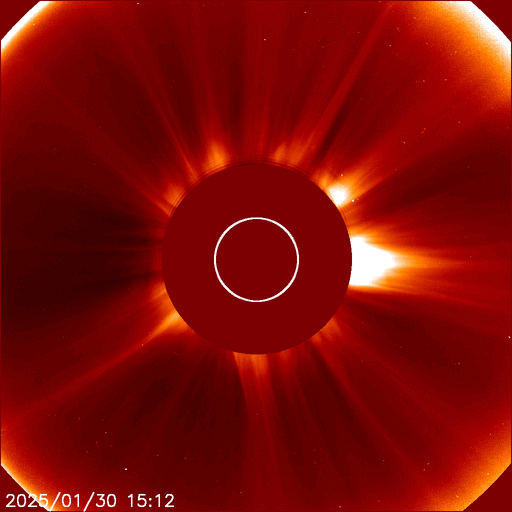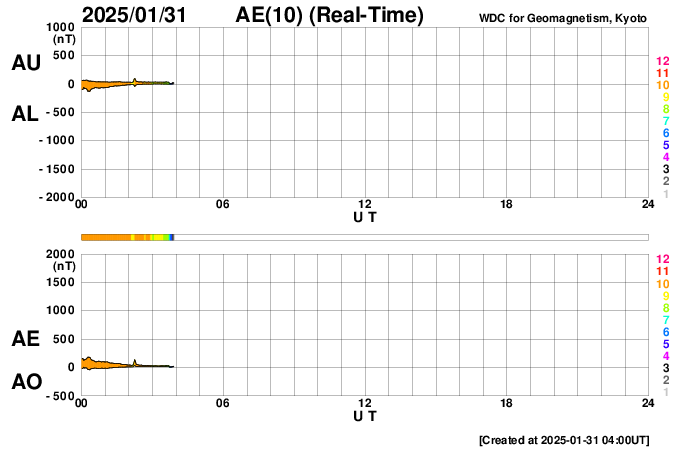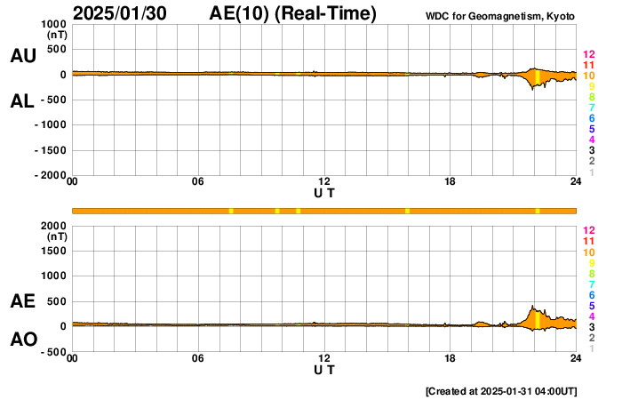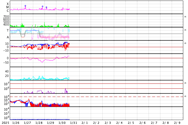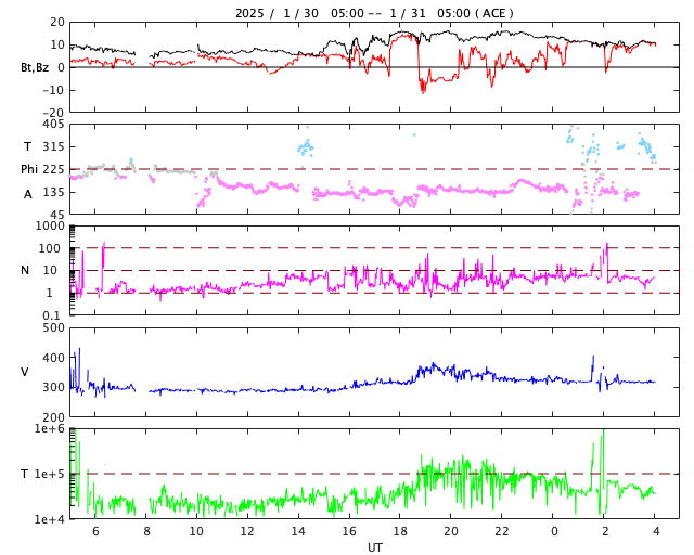 2025/ 1/31 13:20 更新 低速の太陽風が続いています。高速太陽風の到来はまだです。 担当 篠原 太陽風の速度は、300km/秒から350km/秒へ少し上がり、 すぐに320km/秒へ下がって、低速の状態が続いています。 磁場強度は、7〜15nTの間をゆっくり変化しています。 磁場の南北成分は、北寄りで推移しています。 磁気圏は穏やかで、 AE指数は一時的に300nTの小さい変化が起きている程度です。 注目しているコロナホールによる高速の太陽風は まだ到来していません。 この後の太陽風の変化に注目して下さい。 太陽は、北東側(左上)の3976黒点群で、 C8.1、C4.1、C4.3など、 Cクラスの小規模フレアの発生が続いています。 活動の規模が大きくなる様であれば、注目して下さい。 また、30日22時半(世界時30日13時半)頃に、 中心部から南東側(左下)に伸びる領域で、 フィラメント噴出が発生しています。 SDO衛星AIA193の動画を掲載します。 SOHO衛星LASCO C2、C3によると、 太陽の左下に向かってCME(コロナ質量放出)が広がっています。 フィラメント噴出の発生領域が太陽の中心に近いので、 CMEの一部は地球の方向に向かっているかもしれません。 その場合、太陽風に小規模の乱れが見られる可能性があります。