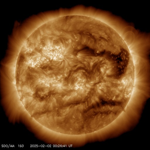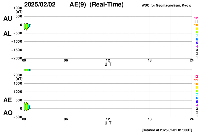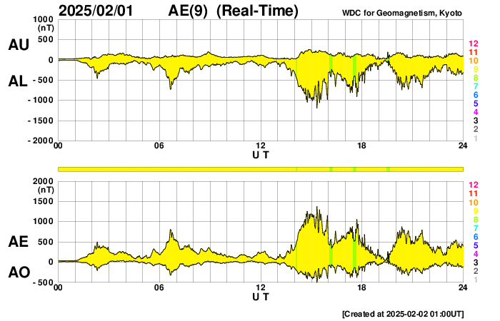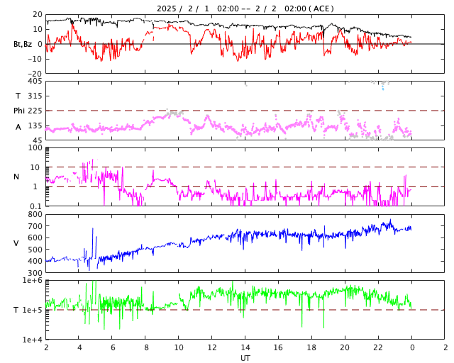 2025/ 2/ 2 10:08 更新 高速の太陽風が到来して、現在は680km/秒に達しています。 担当 篠原 昨日の午後から太陽風速度の上昇が始まり、 1日17時(世界時1日8時)に500km/秒を超えて高速の状態になり、 1日21時(世界時1日12時)には600km/秒に達して、 現在は680km/秒まで高まっています。 SDO衛星AIA193の太陽コロナ写真で、 太陽の北西側(右上)に進んでいるコロナホールの影響が 到来した様です。 一方、15nTに強まっていた太陽風の磁場強度は、 速度が高まるとともにゆっくりと低下して、 現在は4nTと平均的な値に戻っています。 磁場の南北成分は、南北に切り替わりながら変化していて、 磁気圏の活動も強まっています。 AE指数は、速度が高まってきた グラフの後半で変化が大きくなっていて、 800〜1300nTと中規模や大規模の変化が発生しています。 現在の太陽風は、速度は高まっていますが、 磁場強度の強まりは終わっています。 このため、磁気圏活動の規模は一段下がることになりそうです。 コロナホールは、全体が太陽の西側(右側)に進んでいます。 高速太陽風はどのくらい続くでしょうか。 注目して下さい。 太陽は、中心部北東側(左上)の 3977黒点群でM2.4の中規模フレア、 3976群でC6.0の小規模フレアなどが発生しています。 活発というほどの変化ではありませんが、 太陽の中心に近い位置にあるので、 CME(コロナ質量放出)を伴う活動が発生すると、 地球へ影響がやって来る可能性が高くなります。