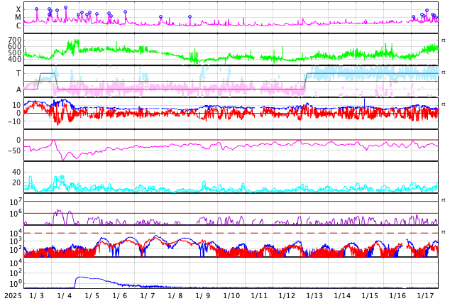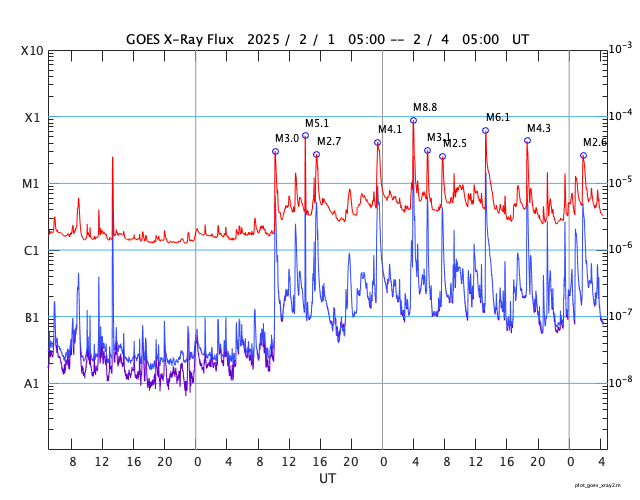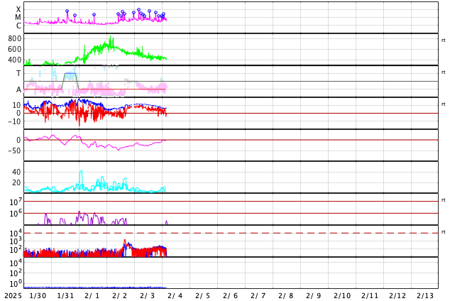 GOES衛星の太陽X線強度。赤・橙 = 0.1〜0.8 nm、青・紫 = 0.05〜0.4 nm (c) データ:NOAA/SWPC、作図:宇宙天気ニュース ![]() | ||||||||||||||||||||||||||||||||||||||||||||||||||||||||||||||||||||||||||||||||||||||||||||||||||||||||||||||||||||||||||||||||||||||||||||||||||||||||||||||||||||||||||||||||||||||||||||||||||||||||||||||||||||||||||||||||||||||||||||||||||||||||||||||||||||||||||||||||||||||||||||||||||||||||||||||||||||||||||||||||||||||||||||||||||||||