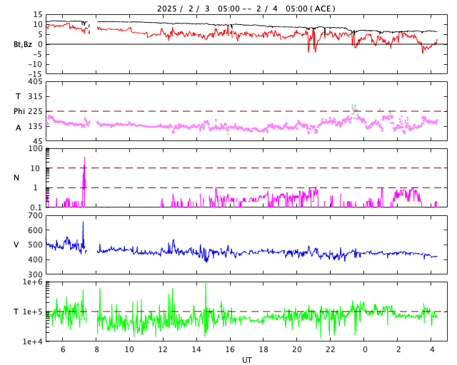 2025/ 2/ 4 13:40 更新 太陽風は平均的な速度に戻りました。ニュージーランドのオーロラとアトラス彗星をどうぞ。 担当 篠原 ニュージーランド南島クィーンズタウンの米戸 実さんより、 オーロラとアトラス彗星が一緒に写った写真をいただきました。 アトラス彗星は、1月11日から17日にかけて、 SOHO衛星やSTEREO Ahead衛星の写真で、 太陽の近くを通り過ぎる様子を連日紹介しました。 その後は、南半球でよく見えているとのことでしたが、 米戸さんより最新情報です。 1枚目の写真は、世界時2月2日10時48分の撮影です。 太陽風は600km/秒と高速で、 AE指数は500nTと中規模の変化が発生していた頃でした。 低空の緑色のオーロラの右端の少し上にアトラス彗星が小さく見えています。 と言っても分かりにくいので、 米戸さんが説明付きの画像も送ってくれました。 2枚目の写真をどうぞ。 カラフルなオーロラの輝きと南天の星座たちに囲まれるように、 彗星がしっかり写っています。 この写真では、アトラス彗星のすぐ上に雲がかかっていて、 彗星の尾が隠されている様です。 3枚目は、この2日前にあたる、世界時1月31日10時20分の撮影です。 太陽風の速度が高まる前で、 AE指数に300nTの小規模の変化が起きた頃の オーロラとアトラス彗星です。 オーロラは赤い光しか見えていませんが、 アトラス彗星の尾がより長く伸びている様子が良く分かります。 米戸さんによると、アトラス彗星の尾は 肉眼でも容易に見ることができたそうです。 これだけの彗星が現れるだけでも素晴らしいですが、 オーロラも一緒に写っているのは更にすごいです。 貴重な写真をどうもありがとうございます。 太陽風は、昨日のニュースの後に速度が500km/秒台を割り、 現在は420km/秒まで下がって、 平均的な速さに戻っています。 27日周期の図を見ると、 今回の高速太陽風は、 2月1日から3日にかけての2日間程度で終わってしまいました。 コロナホールの広がりは大きかったのですが、 高速風の領域は狭かった様です。 太陽風の磁場強度も12nTから6nTへ下がり、 平均的な値に戻っています。 磁場の南北成分は、北寄りで推移しています。 磁気圏は穏やかで、 AE指数は変化のない状態が続いています。 太陽では、中心部北側の3981、3976〜8黒点群で フレアの発生が続いています。 特に3981群でMクラスフレアが続いていて、 昨日のニュース以降、 M8.8、M3.1、M2.5、M6.1、M4.3、M2.6など、 次々に発生しています。 3976〜8群では、C7.1、C7.2、C8.5、C7.9などの 小規模フレアが発生しています。 SDO衛星AIA131の動画を掲載します。 活発に活動する様子が良く分かります。 ![]() ニュージーランド南島クィーンズタウンで、世界時2月2日10時48分に撮影されたオーロラとアトラス彗星。 (c) 米戸 実氏 ![]() 1枚目の写真の説明。 (c) 米戸 実氏 ![]() ニュージーランド南島クィーンズタウンで、世界時1月31日10時20分に撮影されたオーロラとアトラス彗星。 (c) 米戸 実氏 ![]() 左側から、3981黒点群、3978群、3976群、3977群の活動が続いています。 (c) SDO衛星AIA131 (NASA)、(動画加工 : 宇宙天気ニュース) ![]() SDO衛星のAIA193カメラによる太陽コロナの様子 (c) SDO (NASA) ![]() SDO衛星による太陽の可視光写真。マウスの矢印を写真に重ねると、黒点番号付きの写真に切り替わります。 (c) SDO (NASA) ![]() ACEが観測した太陽風の磁場(黒線は全体の強度、赤線は南北成分) 磁場の向き、プラズマの密度、速度、温度 (c) データ:NOAA/SWPC、作図:宇宙天気ニュース ![]() AE指数(速報値) 下段のAEグラフの値が高くなると、オーロラ活動が活発化しています。 (c) 京都大学WDC ![]() ![]() 27日の太陽周期に合わせた図 太陽が同じ面を地球に向けていた27日前の変化から、今後を予想することができます。 (c) 作図:宇宙天気ニュース