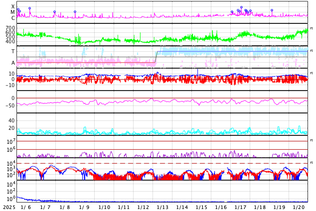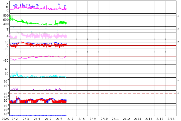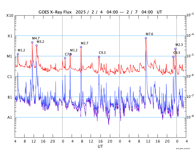 GOES衛星の太陽X線強度。赤・橙 = 0.1〜0.8 nm、青・紫 = 0.05〜0.4 nm (c) データ:NOAA/SWPC、作図:宇宙天気ニュース ![]() | ||||||||||||||||||||||||||||||||||||||||||||||||||||||||||||||||||||||||||||||||||||||||||||||||||||||||||||||||||||||||||||||||||||||||||||||||||||||||||||||||||||||||||||||||||||||||||||||||||||||||||||||||||||||||||||||||||||||||||||||||||||||||||||||||||||||||||||||||||||||||||||||||||||||||||||||||||||||||||||||||||||||||