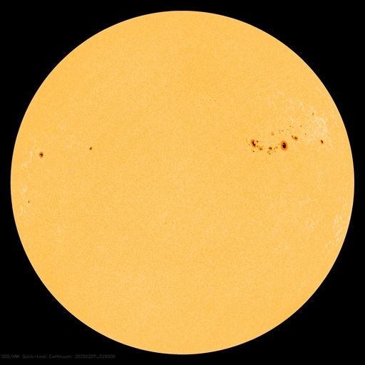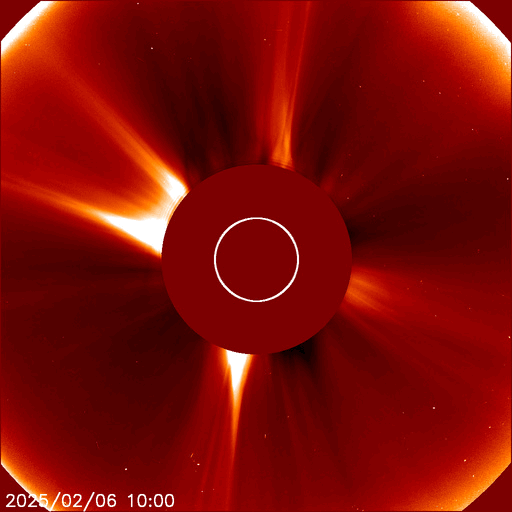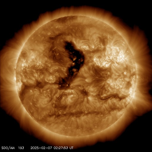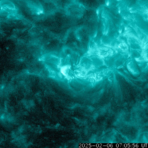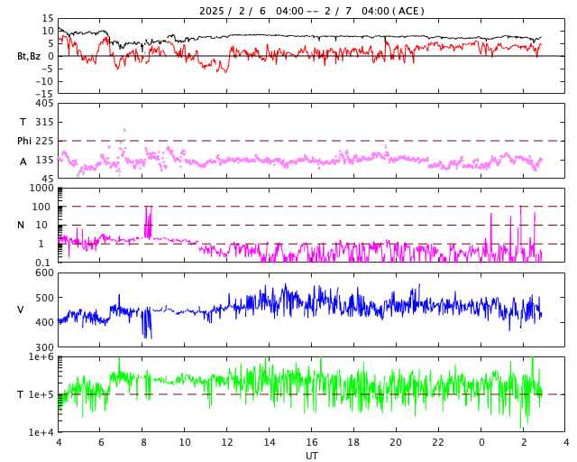 2025/ 2/ 7 12:02 更新 太陽風は平均的な速さです。M7.6の中規模フレアが発生しました。 担当 篠原 太陽風は、速度のデータがやや不安定になっていますが、 450km/秒程度と平均的な速さが続いています。 磁場強度は、10nTから少し下がって、7〜8nTです。 磁場の南北成分は、0nT付近か、弱い北寄りです。 現在、AE指数の最新グラフが停止していて掲載できませんが、 磁気圏は穏やかに推移している様です。 SDO衛星AIA193では、 太陽の中心部の北側にコロナホールが見えています。 3日後くらいから、 この領域の影響で太陽風の速度が高まりそうです。 太陽では、昨夜、6日20時(世界時6日11時)に、 北西(右上)の3981黒点群で、 M7.6の中規模フレアが発生しました。 SDO衛星AIA131の動画を掲載します。 CME(コロナ質量放出)の状況を調べるため、 SOHO衛星LASCO C2、C3に注目すると、 6日21時(世界時6日12時)頃に太陽の上に向かって CMEが飛び出しています。 しかし、CMEのタイミングは良いのですが、 飛び出す方向に違和感があります。 そこで、GOES衛星SUVI 304を見ると、 M7.6フレアが起きた頃に太陽の向こう側でも活動が発生していて、 プロミネンスが上に向かって飛び出していました。 この様に、今回のCMEは太陽の向こう側で発生していました。 太陽では、今朝以降も、3976群でC9.3、3978群でM2.3など、 フレアの発生が続いています。 活動的な黒点群たちは北西の端に近付いて、 地球への影響は及びにくくなっていますが、 注目を続けて下さい。