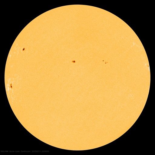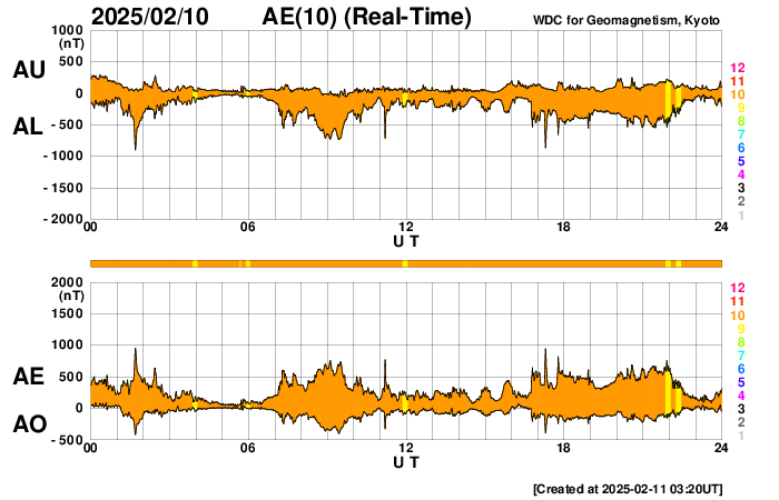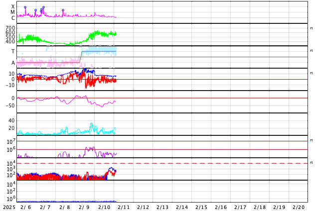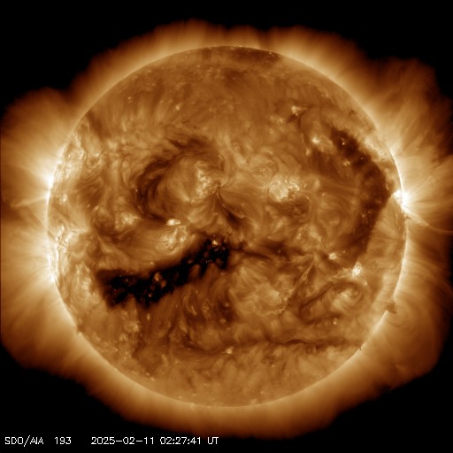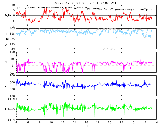 2025/ 2/11 12:25 更新 高速の太陽風が続いています。磁気圏も活動的です。 担当 篠原 太陽風は、550km/秒程度の高速の風が続いています。 磁場強度は、6nTと平均的な状態です。 磁場の南北成分は、 -3〜 -5nT程度の南寄りの変化が続いています。 磁気圏は活動的な状態が続き、 AE指数は、500〜700nTの中規模の変化が度々発生しています。 SDO衛星AIA193では、 現在の高速太陽風をもたらしているコロナホールは 北西の端(右上)にだいぶ近付いています。 この後、太陽風の速度は低下に向かいそうです。 一方、南東側(左下)に次のコロナホールが見えています。 先頭(右端)が太陽の中心線に達しているので、 3日後くらいからこの領域の影響による 太陽風速度の高まりが到来しそうです。 太陽は、昨日のニュース以降は、 C2〜3の小さい小規模フレアが発生した程度です。 フレアを活発に起こしている3981黒点群は、 北西の端に達していて、この後見えなくなります。 太陽は、より穏やかになりそうです。