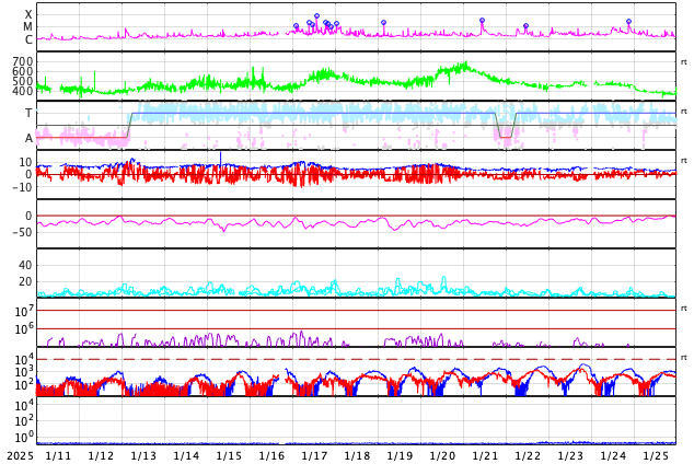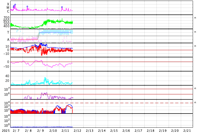 GOES衛星の太陽X線強度。赤・橙 = 0.1〜0.8 nm、青・紫 = 0.05〜0.4 nm (c) データ:NOAA/SWPC、作図:宇宙天気ニュース ![]() | |||||||||||||||||||||||||||||||||||||||||||||||||||||||||||||||||||||||||||||||||||||||||||||||||||||||||||||||||||||||||||||||||||||||||||||||||||||||||||||||||||||||||||||||||||||||||||||||||||||||||||||||||||||||||||||||||||||||||||||||||||||||||||||||||||