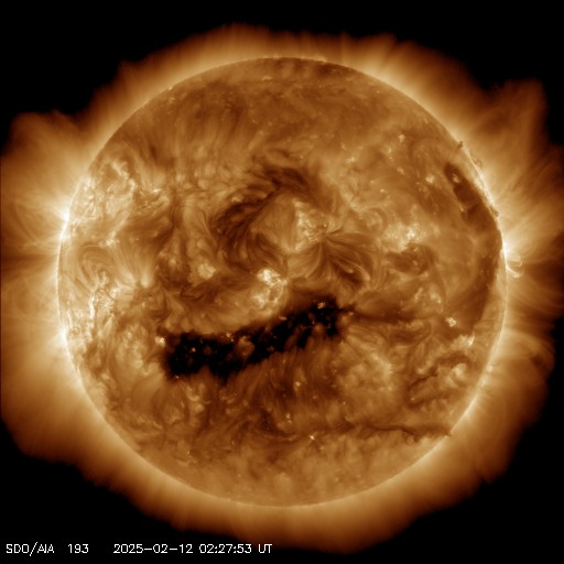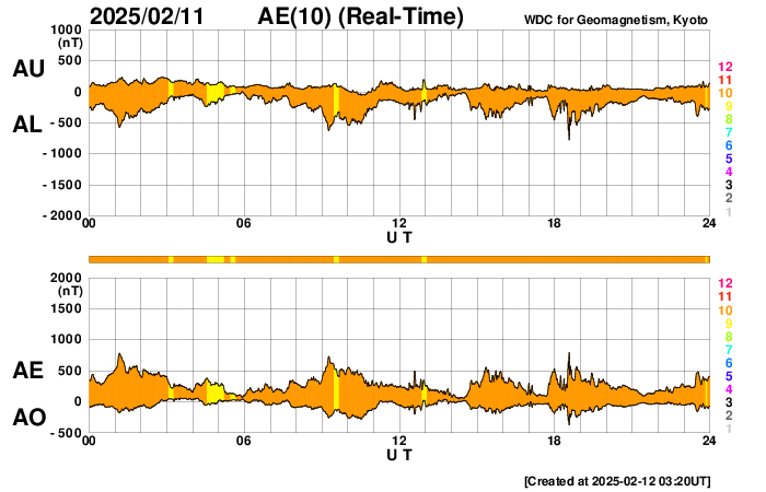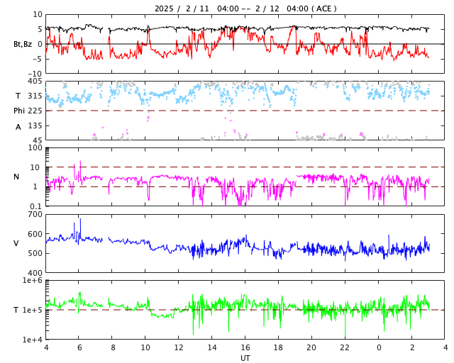 2025/ 2/12 12:20 更新 高速の太陽風が続いていますが、速度は少し下がっています。 担当 篠原 太陽風は高速の状態が続いていますが、 速度は570km/秒から500km/秒へ少し下がっています。 磁場強度は、6nTと平均的な値で安定しています。 太陽風磁場の南北成分は、 比較的南寄りで推移しています。 このため、磁気圏はやや活動的な状態が続いていて、 AE指数は、500nTに達するくらいの変化が繰り返し発生しています。 SDO衛星AIA193の太陽コロナ写真を見ると、 北西(右上)のコロナホールは、 太陽の西の端に達しようとしています。 高速太陽風は続いていますが、この後、影響は弱まりそうです。 一方、中心部の南半球側には、 次のコロナホールが東西に伸びています。 明後日くらいから、こちらの影響で太陽風の速度が高まりそうです。 太陽は、北西の端に達した3981黒点群で、 M1.6の中規模フレアやC7.6の小規模フレアなどが発生しています。 現在は、3981群は太陽の向こう側に進んでいて、 見えなくなっています。 一方、太陽の南東の端(左下)の3991群で、 C7.2の小規模フレアが発生しています。 今のところ活動的という様子ではありませんが、 この後はどうでしょうか。