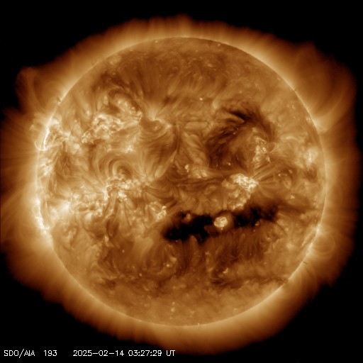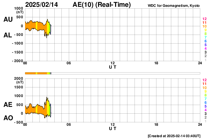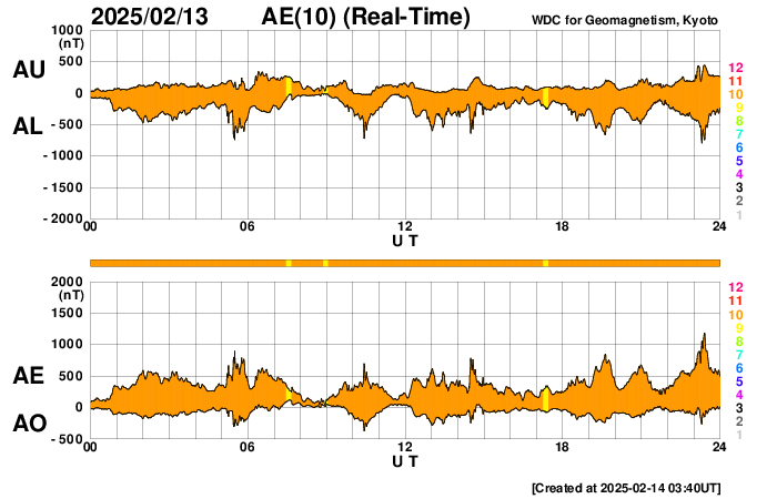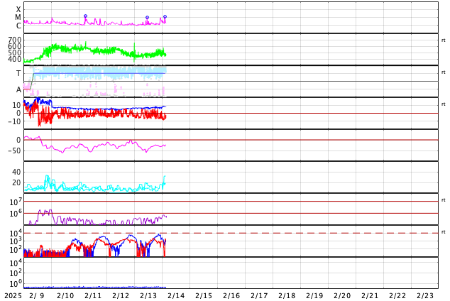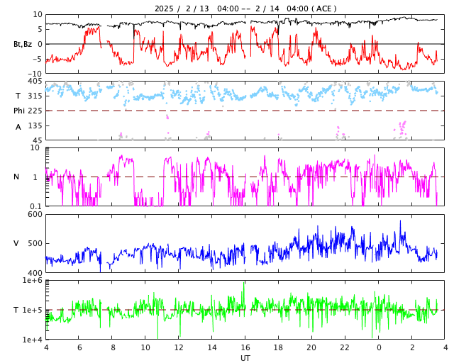 2025/ 2/14 12:46 更新 太陽風の速度が少し高まっています。磁気圏は活動的です。 担当 篠原 太陽風の速度は、データが不安定になっていますが、 450km/秒から少し上がって、 500km/秒付近に達している様です。 小幅ですが、磁場強度も7nTから8nTに上がっています。 SDO衛星AIA193の南半球側に見えている コロナホールの影響が始まっているのかもしれません。 この後も速度が高まるか、注目して下さい。 太陽風磁場の南北成分は、南寄りの変化が続いていて、 -5nTを超えるくらいになっています。 磁気圏は活動的な状態が続いていて、 AE指数は、500nTから、 大きい時は1000nTに達する変化が続いています。 太陽は、南西(右下)の3992黒点群でM1.0の中規模フレア。 南東(左下)の3990群でC9.0の小規模フレア。 そして、南東の端でM1.2の中規模フレアと、 あちこちである程度の規模のフレアが 発生するようになっています。 この後、さらに活動が強まる領域はあるでしょうか。 ![]() SDO衛星のAIA193カメラによる太陽コロナの様子 (c) SDO (NASA) ![]() SDO衛星による太陽の可視光写真。マウスの矢印を写真に重ねると、黒点番号付きの写真に切り替わります。 (c) SDO (NASA) ![]() ACEが観測した太陽風の磁場(黒線は全体の強度、赤線は南北成分) 磁場の向き、プラズマの密度、速度、温度 (c) データ:NOAA/SWPC、作図:宇宙天気ニュース ![]() AE指数(速報値) 下段のAEグラフの値が高くなると、オーロラ活動が活発化しています。 (c) 京都大学WDC ![]() ![]() 27日の太陽周期に合わせた図 太陽が同じ面を地球に向けていた27日前の変化から、今後を予想することができます。 (c) 作図:宇宙天気ニュース