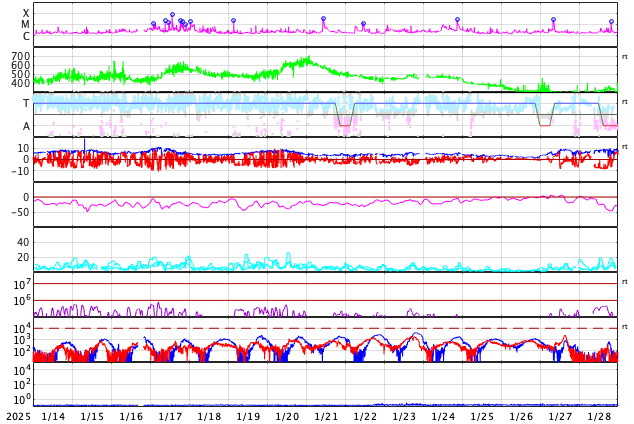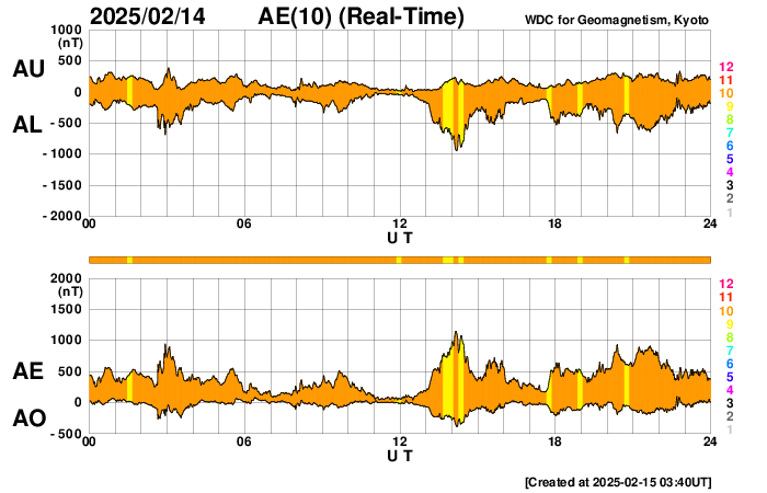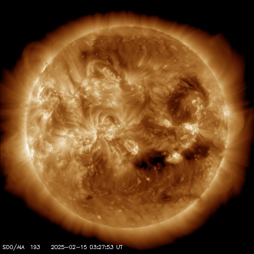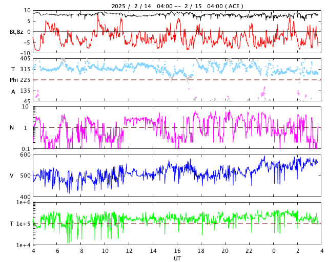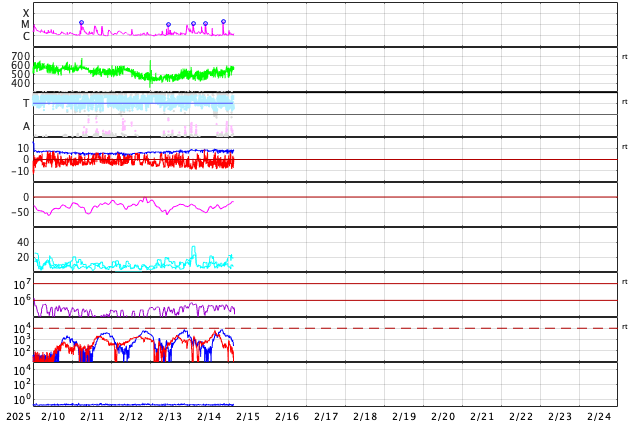 2025/ 2/15 12:59 更新 太陽風の速度が高まり、磁気圏も活動的です。フレアが少し増えています。 担当 篠原 太陽風の速度は、昨夜には500km/秒にしっかりと達し、 その後更に高まって,現在は560km/秒付近で推移しています。 コロナホールの影響が強まって来た様です。 磁場強度は、8nTとやや強まった状態が続いています。 南北成分は南寄りが続いていて、 -5nT程度の変化が頻繁に発生しています。 磁気圏は活動的な状態が続いていて、 AE指数は、500〜1000nTの中規模の変化が発生しています。 SDO衛星AIA193では、 コロナホールは最後の部分(左端)が 太陽の中心線を通り過ぎたところです。 太陽風速度の高まりは、この後、4〜5日程度続くかもしれません。 太陽は、中心部南東側(左下)の3990黒点群で、 M1.2とM1.8の2つの中規模フレアが発生しています。 その他にも、Cクラスの小規模フレアが あちこちで発生しています。 X線グラフは少しにぎやかになっています。