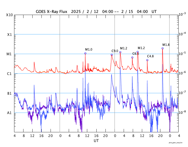 GOES衛星の太陽X線強度。赤・橙 = 0.1〜0.8 nm、青・紫 = 0.05〜0.4 nm (c) データ:NOAA/SWPC、作図:宇宙天気ニュース ![]() | |||||||||||||||||||||||||||||||||||||||||||||||||||||||||||||||||||||||||||||||||||||||||||||||||||||||||||||||||||||||||||||||||||||||||||||||||||||||||||||||||||||||||||||||||||||||||||||||||||||||||||||||||||||||||||||||||||||||||||||||||||||||||||||||||||||||||||||