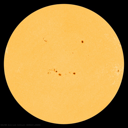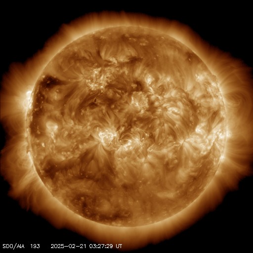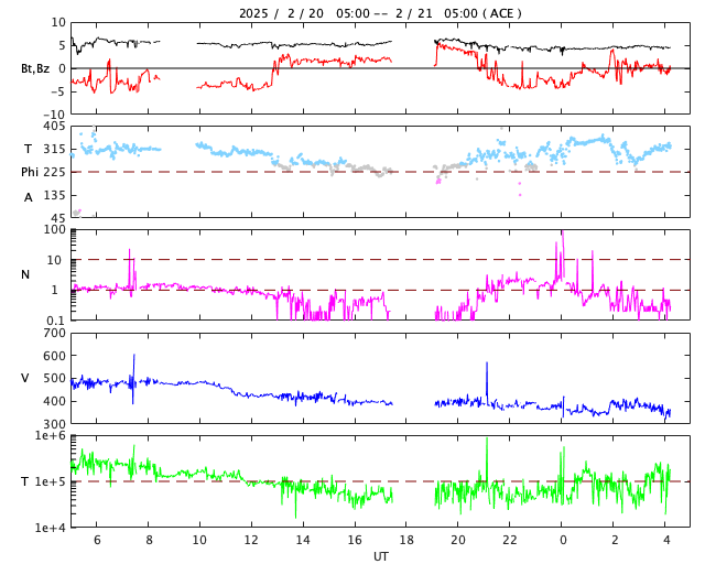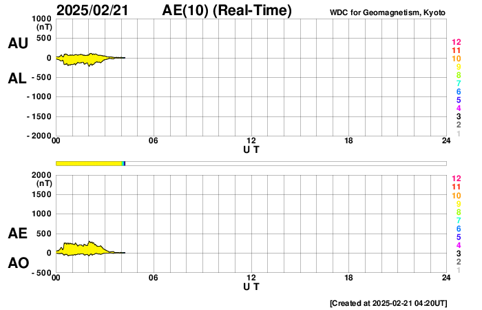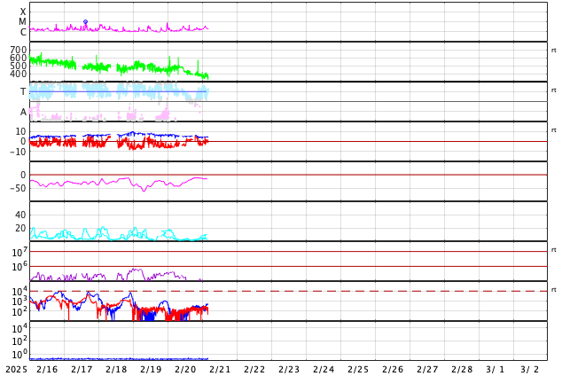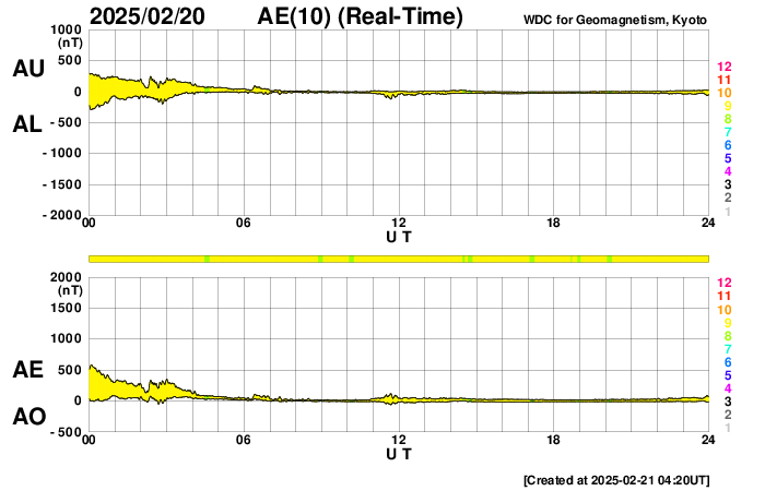 2025/ 2/21 13:23 更新 太陽風は低速になっている様です。磁気圏は穏やかです。アラスカのオーロラをどうぞ。 担当 篠原 アラスカ・フェアバンクスに滞在中の藤井哲也さんより、 現地20日0時(世界時20日9時)頃に撮影された オーロラの写真をいただきました。 ウェッジウッド野生鳥獣保護区の凍りついた池の上とのことです。 今日掲載しているAE指数を見ると、 グラフの途中からほとんど変化が見られない状態で、 オーロラを見るにはかなり厳しい条件だった様です。 藤井さんによると、ここで3時間程待ち続けて、 0時過ぎに東の空にオーロラが現れ、 20分ほど一直線上にたなびいた後、 一気に弱くなってしまったとのことです。 そのオーロラの輝きを捉えた1枚で、 オーロラの下部に朱色や緑色が現れてとても神秘的だったとのことです。 この夜は、太陽風の条件が厳しかった様です。 その中でも、雰囲気のあるきれいな写真をありがとうございます。 太陽風は、速度が480km/秒から370km/秒程度に下がり、 低速の状態になっている様です。 磁場強度は、4〜5nTと平均的な値です。 磁場の南北成分は、 グラフでは初めに南寄りの時間帯がありますが、 AE指数はほとんど変化していないので、 磁場の値にずれがあるのかもしれません。 その後、北向きに切り替わり、 グラフの最後で少し南を向いて、現在は0nT付近です。 磁気圏は静穏で、AE指数は変化のない時間帯が1日近く続き、 最後で小規模の変化が発生しています。 SDO衛星AIA193では、太陽の中心部にコロナホールはなく、 太陽風は穏やかな状態が続きそうです。 今日の写真では、北東の端(左上)にコロナホールが見え始めています。 次の太陽風の高まりは、この領域の影響になるかもしれません。 太陽は、中心部南側の3996黒点群がやや活動的で、 C4.9の小規模フレアや、小さい活動が頻繁に発生しています。