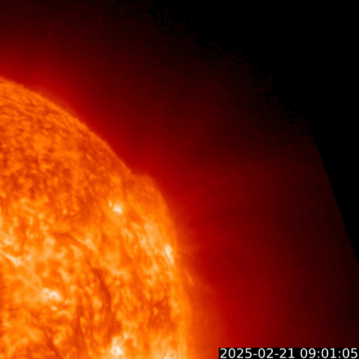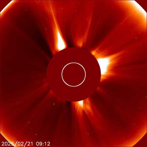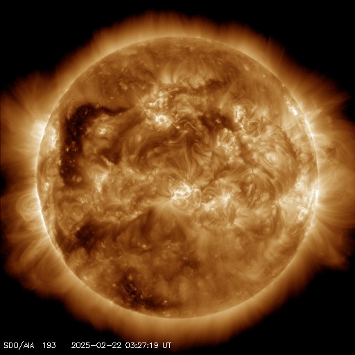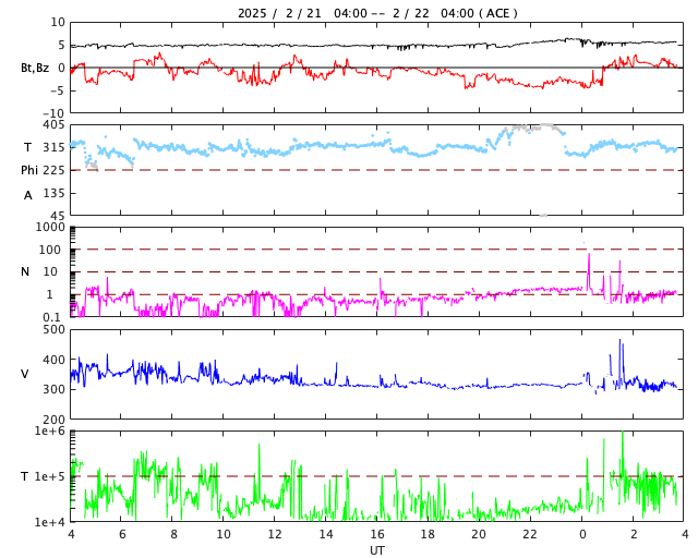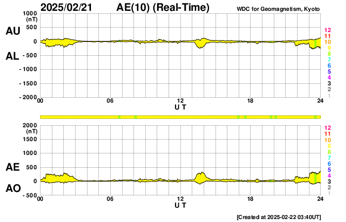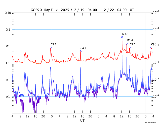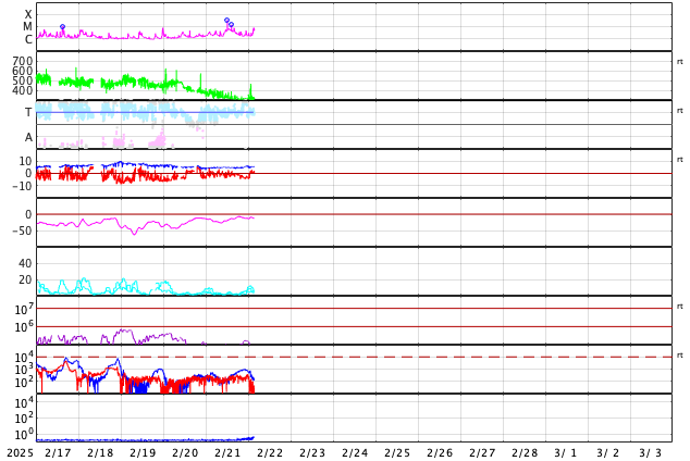 2025/ 2/22 12:57 更新 太陽風は更に低速になっています。M3.3の中規模フレアが発生しました。 担当 篠原 太陽風の速度は、350km/秒からさらに低下して、 320km/秒付近と、より低速になっています。 磁場強度は、5nTと平均的な状態です。 磁場の南北成分は、 弱い南寄りの変化が度々発生しています。 この変化に対応するように、 AE指数では300nT程度の小規模の変化が発生しています。 太陽風のグラフの最後では、 磁場の南北成分は0nT付近に下がっています。 この傾向が続くと磁気圏は穏やかになるでしょう。 SDO衛星AIA193では、 北東(左上)と南東(左下)のコロナホールの広がりが 見える様になっています。 注目して下さい。 太陽では、昨夜、21日19時(世界時21日10時)頃に、 北西の端近く(右上)で、プロミネンス噴出が発生しました。 GOES衛星SUVI 304の動画を掲載します。 この噴出により、太陽の右上へ広がるCME(コロナ質量放出)が SOHO衛星LASCO C2、C3で観測されています。 横方向の噴出に近いので、地球への影響はないでしょう。 また、中心部北側(上側)の4000黒点群で、 21日21時と23時半(世界時21日12時と14時半)に、 M3.3とM1.4の中規模フレアが発生しています。 M3の規模に達するフレアの発生は、 2月7日のM7.5以来で、2週間ぶりです。 今日の黒点群リストに、4000番の黒点群が現れていますが、 この番号は1万を省略しているので、正確には14000群です。 ちなみに、3000群は2022年4月27日に出現しています(この日の記事)。 1000群現れるのに2年10か月かかりました。 次の5000群はいつになるでしょうか。