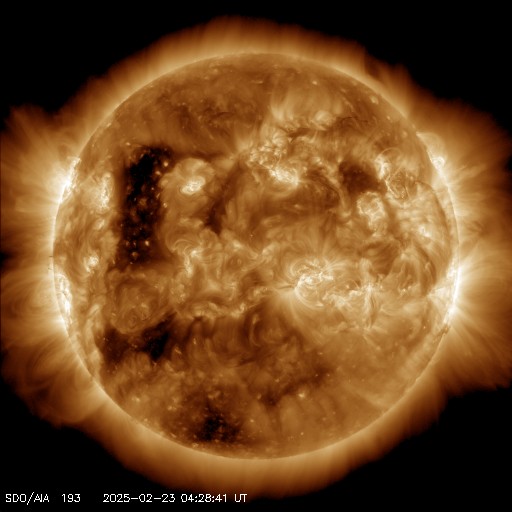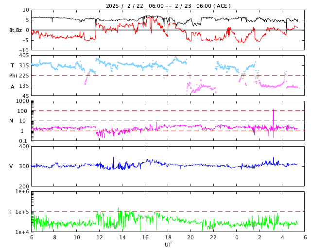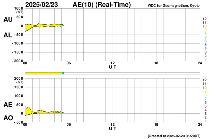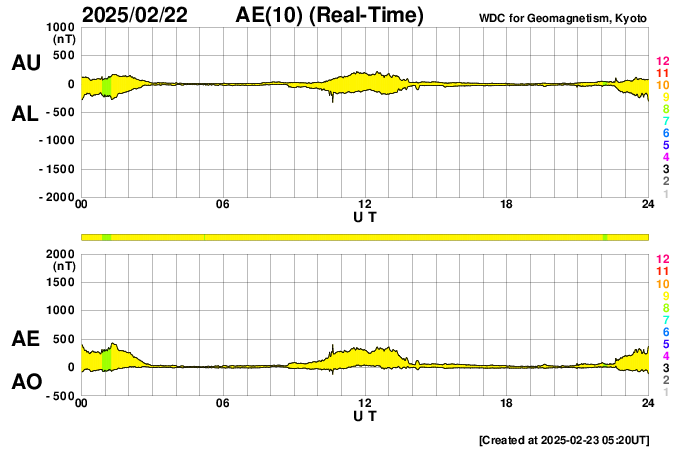 2025/ 2/23 14:33 更新 低速の太陽風が続いています。アラスカのオーロラと大火球をどうぞ。 担当 篠原 アラスカ・フェアバンクスに滞在中の藤井哲也さんと、 一緒に観測されている八板康麿さんより、 現地21日未明に撮影されたオーロラと大火球の写真をいただきました。 1枚目と2枚目はほぼ同時の撮影ですが、 レンズが、1枚目は15mm、2枚目は24mmとのことで、 1枚目はより広い範囲を、2枚目はオーロラの細かい様子が それぞれ見やすくなっています。 この夜のオーロラの活動は弱く、空も曇っていたそうです。 現地21日22時過ぎから3時間程待機して、 22日1時頃から晴れてきて、 薄雲を通してオーロラが見え始めたとのことです。 雲の隙間から見えるオーロラの光り方が 魚のうろこの様だったとお二人が表現されています。 22日のAE指数を見ると、 世界時10時頃から活動が強まり始めて、 300nTの小規模の変化に達しています。 この変化を捉えた様です。 3、4枚目は、オーロラと重なりながら北東に落ちていった大火球です。 数秒くらいの差で、輝き初めと激しく輝いた頃の連続撮影になっています。 発光中、一部がオレンジ色に発光し、満月くらい・金星の数倍(お二人の表現です) の明るさに感じたとのことです。 3枚目の露出は1/2秒、4枚目は1秒とのことです。 一瞬の素晴らしい光景だったことでしょう。 現地の貴重な情報をありがとうございます。 現在の太陽風は、速度は300km/秒とだいぶ低速になっています。 磁場強度は、5nT前後と平均的な状態です。 磁場の南北成分は、グラフの前半は南寄り、中盤は北寄り、 後半は再び南寄りと傾向が切り替わっています。 速度が下がっているので磁気圏の活動は低調ですが、 AE指数は、小規模の活動が発生して、しばらく穏やかになり、 再び小規模の活動が発生するという推移になっています。 現在の太陽風は、磁場の南北成分が0nT付近になっていて、 AE指数も最後は変化がなくなっています。 SDO衛星AIA193では、 北東側(左上)にコロナホールが広がっています。 5〜6日後くらいから影響が始まりそうです。 太陽は、北西の端(右上)の4001黒点群で、 23日11時(世界時23日2時)に、 M4.9の中規模フレアが発生しています。 ![]() 21日1時23分(世界時21日10時23分)に、アラスカ・フェアバンクスで撮影したオーロラ。 (c) 藤井哲也氏 ![]() 21日1時23分(世界時21日10時23分)に、アラスカ・フェアバンクスで撮影したオーロラ。 (c) 八板康麿氏 ![]() 21日1時32分(世界時21日10時32分)に、アラスカ・フェアバンクスで撮影した大火球の初め頃の写真。 (c) 八板康麿氏 ![]() 21日1時32分55秒(世界時21日10時32分55秒)に、アラスカ・フェアバンクスで撮影した大火球の後半の写真。 (c) 藤井哲也氏 ![]() 4001黒点群で発生した、M4.9の中規模フレア。 (c) SDO衛星AIA131 (NASA)、(動画加工 : 宇宙天気ニュース) ![]() SDO衛星のAIA193カメラによる太陽コロナの様子 (c) SDO (NASA) ![]() SDO衛星による太陽の可視光写真。マウスの矢印を写真に重ねると、黒点番号付きの写真に切り替わります。 (c) SDO (NASA) ![]() ACEが観測した太陽風の磁場(黒線は全体の強度、赤線は南北成分) 磁場の向き、プラズマの密度、速度、温度 (c) データ:NOAA/SWPC、作図:宇宙天気ニュース ![]() AE指数(速報値) 下段のAEグラフの値が高くなると、オーロラ活動が活発化しています。 (c) 京都大学WDC ![]() ![]() 27日の太陽周期に合わせた図 太陽が同じ面を地球に向けていた27日前の変化から、今後を予想することができます。 (c) 作図:宇宙天気ニュース