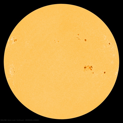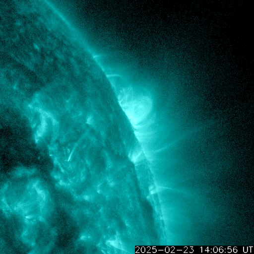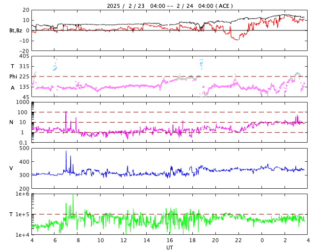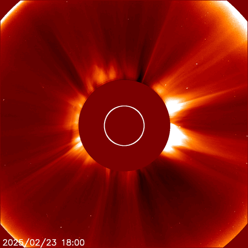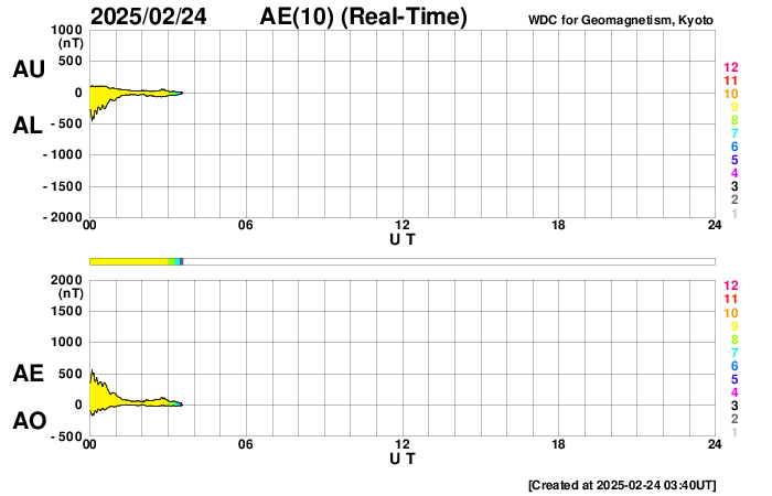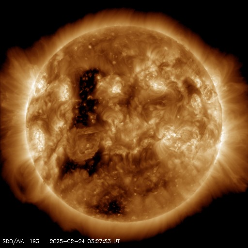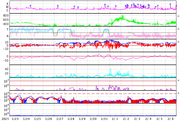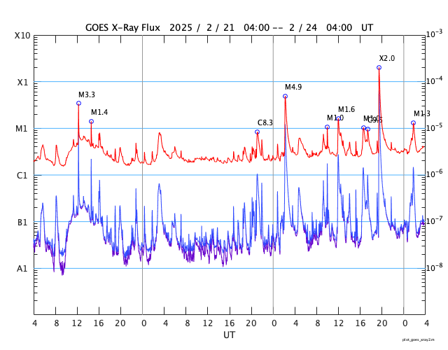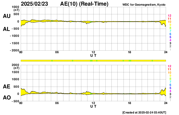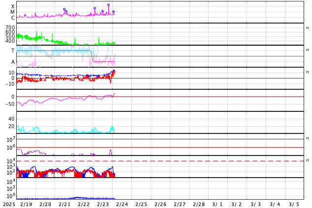 2025/ 2/24 13:00 更新 X2.0の大規模フレアが発生しました。太陽風は低速ですが、磁場が強まっています。 担当 篠原 今朝、24日4時半(世界時23日19時半)に、 北西の端(右上)の少し向こう側に進んだ4001黒点群で、 X2.0の大規模フレアが発生しました。 SDO衛星AIA131の動画を掲載します。 Xクラスのフレアの発生は、1月4日のX1.8以来と1か月半ぶり。 また、X2に達するフレアでは、 12月8日のX2.2以来で2か月半ぶりです。 このフレアに伴って、 CME(コロナ質量放出)が太陽の右上へ広がっています。 地球に対しては横向きの噴出なので、影響はないでしょう。 太陽では、南西(右下)の3998群でもフレアが発生していて、 C7.5、M1.0、M1.0、C5.4などの 中規模、小規模フレアが発生しています。 太陽風は、300km/秒から340km/秒へ速度が少し上がっていますが、 低速の状態は続いています。 磁場強度は、今朝までは6nTと平均的な値が続いていましたが、 グラフの後半で次第に上昇して、現在は14nTに強まっています。 磁場の南北成分は、磁場が強まるとともに南北の変化が大きくなり、 一時的に-9nTと南向きに強まった後、 北向きに10nT前後に強まっています。 磁気圏の活動は、一時的な南向きの頃に AE指数で500nTの中規模の変化が発生していますが、 その他は穏やかな状態が続いています。 現在の磁場の強まりが続き、 南北成分が南向きに切り替わると、 磁気圏の活動がある程度高まる可能性があります。 引き続き注目してください。 SDO衛星AIA193では、 東側のコロナホールが中心線に近付いています。 4〜5日後くらいから、太陽風に影響が現れそうです。 ![]() 北西の端の少し向こう側に進んだ4001黒点群で発生した、X2.0の大規模フレア。 (c) SDO衛星AIA131 (NASA)、(動画加工 : 宇宙天気ニュース) ![]() 太陽の右上へ飛び出すCME。 (c) SOHO衛星LASCO C2、C3 (ESA & NASA)、(動画加工 : 宇宙天気ニュース) ![]() SDO衛星のAIA193カメラによる太陽コロナの様子 (c) SDO (NASA) ![]() SDO衛星による太陽の可視光写真。マウスの矢印を写真に重ねると、黒点番号付きの写真に切り替わります。 (c) SDO (NASA) ![]() GOES衛星の太陽X線強度。赤・橙 = 0.1〜0.8 nm、青・紫 = 0.05〜0.4 nm (c) データ:NOAA/SWPC、作図:宇宙天気ニュース ![]() ACEが観測した太陽風の磁場(黒線は全体の強度、赤線は南北成分) 磁場の向き、プラズマの密度、速度、温度 (c) データ:NOAA/SWPC、作図:宇宙天気ニュース ![]() AE指数(速報値) 下段のAEグラフの値が高くなると、オーロラ活動が活発化しています。 (c) 京都大学WDC ![]() ![]() 27日の太陽周期に合わせた図 太陽が同じ面を地球に向けていた27日前の変化から、今後を予想することができます。 (c) 作図:宇宙天気ニュース