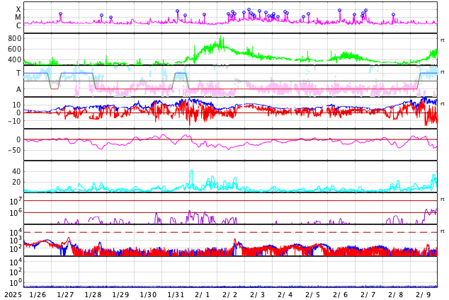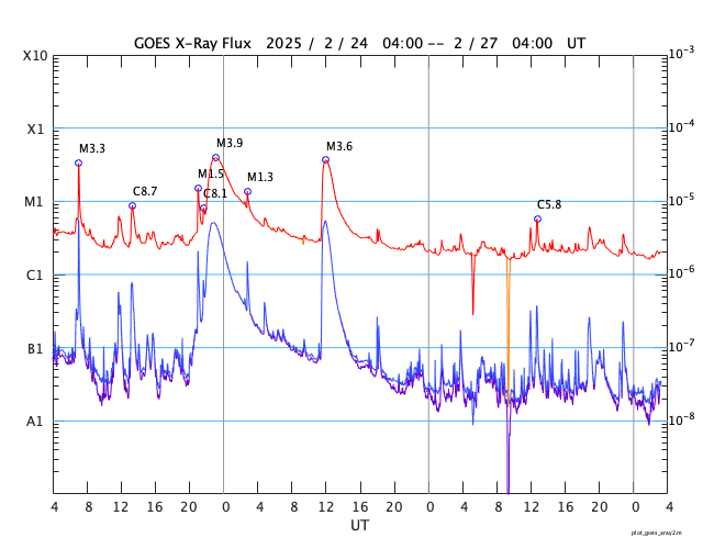 GOES衛星の太陽X線強度。赤・橙 = 0.1〜0.8 nm、青・紫 = 0.05〜0.4 nm (c) データ:NOAA/SWPC、作図:宇宙天気ニュース ![]() | |||||||||||||||||||||||||||||||||||||||||||||||||||||||||||||||||||||||||||||||||||||||||||||||||||||||||||||||||||||||||||||||||||||||||||||||||||||||||||||||||||||||||||||||||||||||||||||||||||||||||||||||||||||||||||||||||||||||||||||||||||||||||||||||||||