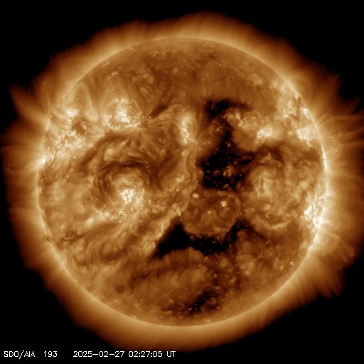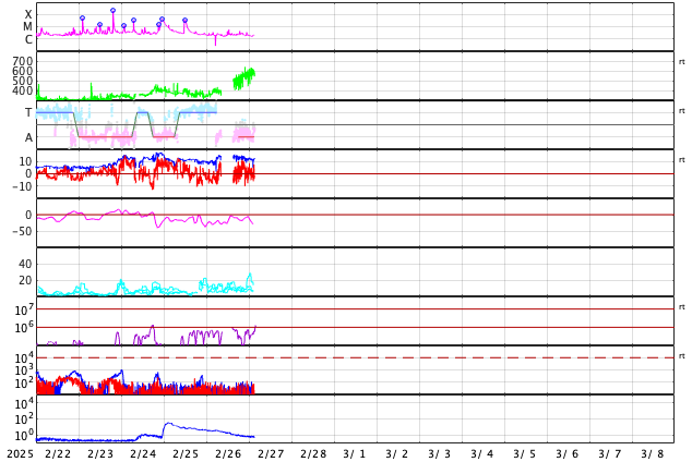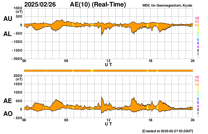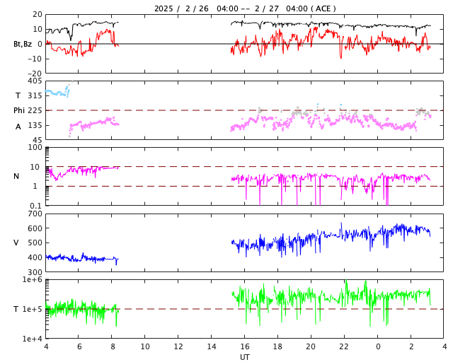 2025/ 2/27 12:23 更新 高速太陽風が到来し、600km/秒に高まっています。アラスカのオーロラをどうぞ。 担当 篠原 アラスカ・フェアバンクスに滞在中の藤井哲也さんと八板康麿さんより、 現地2月25日夜のオーロラ写真を頂きました。 太陽風の速度は400km/秒と、高まる直前の撮影です。 今日は、現地25日23時から26日1時(世界時26日8時から10時) 頃に撮影された写真を紹介します(続きは明日に)。 AE指数では変化が小さい時間帯だったのですが、 現地ではきれいなオーロラを見ることができた様です。 撮影場所は、フェアバンクス近郊のチャタニカで、 周りには街灯などの明かりはなく、空は真っ暗だそうです。 快晴で、気温はマイナス20度。 ポケットの中のカイロの暖かさで寒さをしのぐことができたそうです。 3枚目の全天カメラでは、オーロラが大きく広がる様子が良く分かります。 どうもありがとうございます。 明日に続きます。 太陽風は、昨夜遅くから速度が高まり、 400km/秒と平均的な状態から500km/秒と高速の風に変わり、 その後更に高まって、現在は600km/秒に達しています。 磁場強度は、10nTから15nTに強まり、 その後10nTへ下がるという変化をしていますが、 強まった状態は続いています。 SDO衛星AIA193の太陽コロナ写真で見えていた コロナホールの影響がやって来た様です。 27日周期の図を見ると、 前周期の高まり(2月1日)よりも1日半くらい到来が早くなっています。 磁場の南北成分は、速度が高まった後は、 0nT付近で南北に変化しています。 磁気圏の活動はある程度高まっていて、 AE指数は、500〜700nTの中規模の変化が数回発生しています。 前周期の高速風は2日程度で終わりましたが、 今回は継続時間が長くなるかもしれません。 今後の推移に注目して下さい。 太陽は、中心部南東(左下)の4007黒点群でC5.7、 南西の端(右下)の3998群でC4.4の小規模フレアが発生した程度で、 活動は少なくなっています。