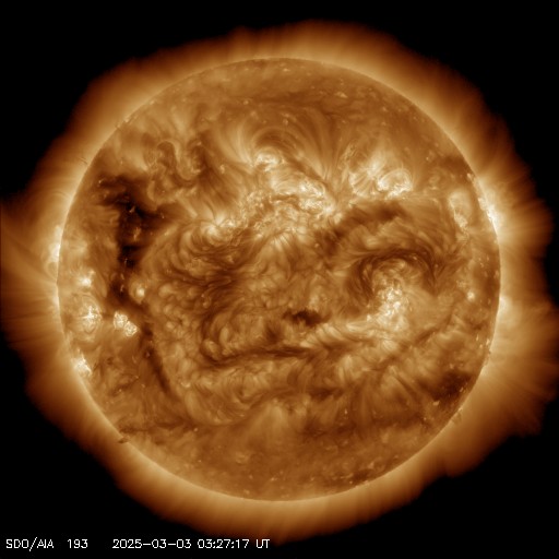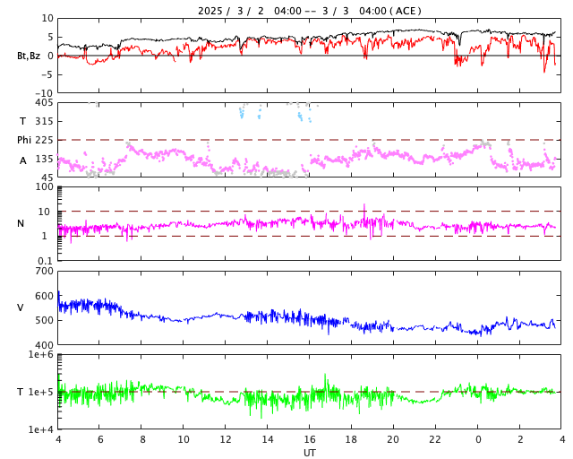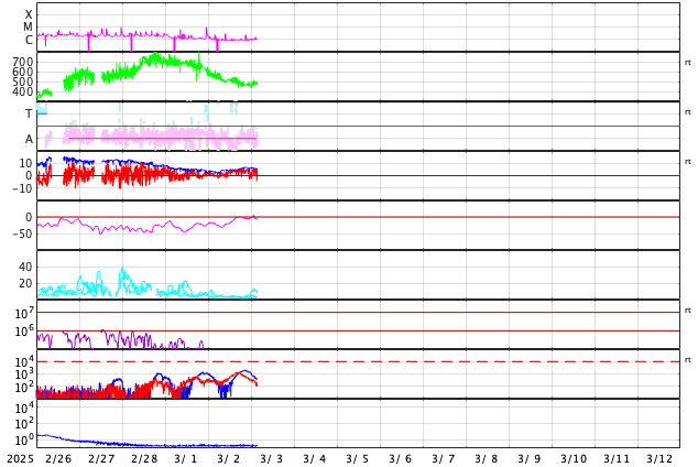 - 2025/ 3/ 2 12:45 太陽風は高速の状態が続いていますが、速度は下がり始めています。