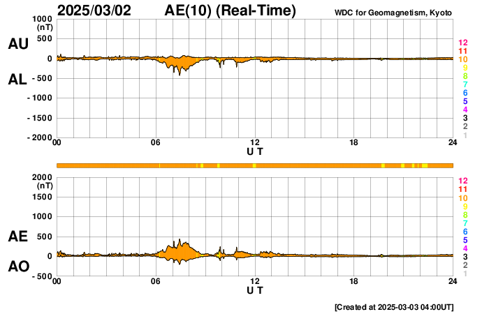 下段のAEグラフの値が高くなると、オーロラ活動が活発化しています。