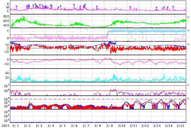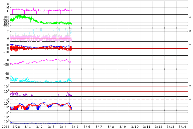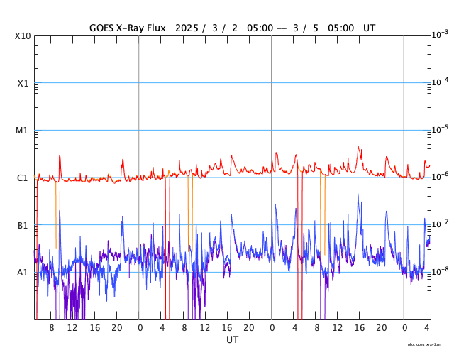 GOES衛星の太陽X線強度。赤・橙 = 0.1〜0.8 nm、青・紫 = 0.05〜0.4 nm (c) データ:NOAA/SWPC、作図:宇宙天気ニュース ![]() | ||||||||||||||||||||||||||||||||||||||||||||||||||||||||||||||||||||||||||||||||||||||||||||||||||||||||||||||||||||||||||||||||||||||||||||||||||||||||||||||||||||||||||||||||||||||||||||||||||||||||||||||||||||||||||||||||||||||||||||||||||||||||||||||||||||||||