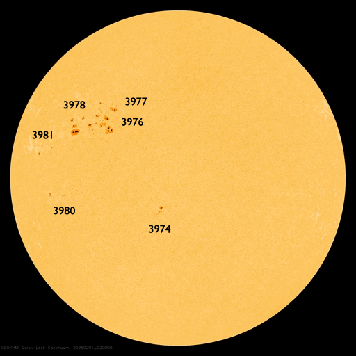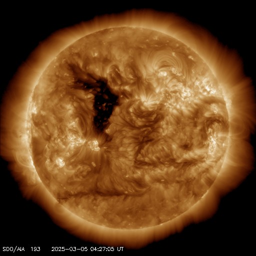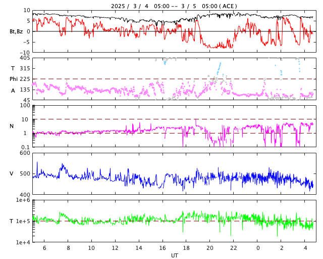 2025/ 3/ 5 13:56 更新 太陽風は平均的な速度です。2月の黒点相対数は 154.6 でした。 担当 篠原 WDC-SILSO より、2月の黒点相対数月平均値は、 154.6 と発表されました。 1月の137.0からは高まっていて、 2024年5~12月の高まりに少し戻るような変化になっています。 1日値を見ると、2桁の日は1日しかなく(1月は6日ありました)、 黒点が見られる日が安定して続いたということかもしれません、 また、赤色線で示している13か月平均値は、 最新値は2024年8月の156.7となっていて、 グラフとしては増加が続いています。 2月までの月平均値から今後を予想すると、 もう2か月くらいは増加しそうですが、 以降は低下に向かいそうです。 この長期変化の推移にも注目して下さい。 太陽風は、速度の値がやや不安定ですが、 500km/秒近い値から次第に低下して、 グラフの最後は450klm/秒程度になっています。 磁場強度は、5~8nTの間をゆっくりと変化しています。 磁場の南北成分は、グラフの初めは北寄りでしたが、 後半は南寄りに切り替わっています。 磁気圏の活動もこれに対応して、 AE指数はグラフの途中から変化が大きくなり、 1000nTを超える大きい変化が発生しています。 現在も500nT近い変化が続いています。 SDO衛星AIA193では、 コロナホールが太陽の中心線に達しようとしています。 ここから吹き出している速度の高い太陽風が、 8~9日くらいから地球に到来しそうです。 太陽は、南東(左下)の4012黒点群で、 C4.6、C3.9などの小規模フレアが発生しています。 全体としては比較的穏やかな状態です。 部活動の引率で、6日から11日にかけて種子島に行きます。 (学生たちが種子島ロケットコンテストに参加します) この期間は記事の更新時刻が不安定になります。 ご了解下さい。 (これから荷造りです) ![]() 太陽黒点相対数の長期変化。2月の黒点相対数は 154.6 でした。 (c) 黒点データ:WDC-SILSO、作図:宇宙天気ニュース ![]() 2月の太陽黒点の推移。 (c) SDO衛星HMII (NASA)、(動画加工 : 宇宙天気ニュース) ![]() 1975年以降の太陽黒点相対数の長期変化。 (c) 黒点データ:WDC-SILSO、作図:宇宙天気ニュース ![]() SDO衛星のAIA193カメラによる太陽コロナの様子 (c) SDO (NASA) ![]() SDO衛星による太陽の可視光写真。マウスの矢印を写真に重ねると、黒点番号付きの写真に切り替わります。 (c) SDO (NASA) ![]() ACEが観測した太陽風の磁場(黒線は全体の強度、赤線は南北成分) 磁場の向き、プラズマの密度、速度、温度 (c) データ:NOAA/SWPC、作図:宇宙天気ニュース ![]() AE指数(速報値) 下段のAEグラフの値が高くなると、オーロラ活動が活発化しています。 (c) 京都大学WDC ![]() ![]() 27日の太陽周期に合わせた図 太陽が同じ面を地球に向けていた27日前の変化から、今後を予想することができます。 (c) 作図:宇宙天気ニュース