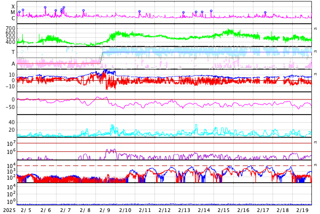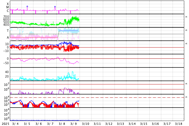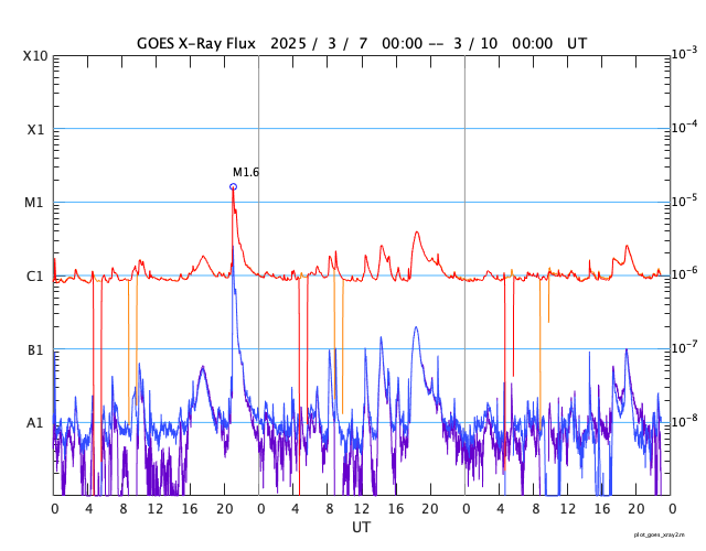 GOES衛星の太陽X線強度。赤・橙 = 0.1〜0.8 nm、青・紫 = 0.05〜0.4 nm (c) データ:NOAA/SWPC、作図:宇宙天気ニュース ![]() | ||||||||||||||||||||||||||||||||||||||||||||||||||||||||||||||||||||||||||||||||||||||||||||||||||||||||||||||||||||||||||||||||||||||||||||||||||||||||||||||||||||||||||||||||||||||||||||||||||||||||||||||||||||||||||||||||||||