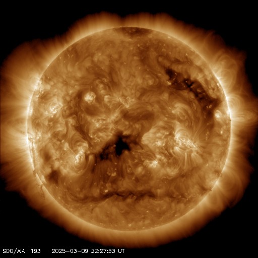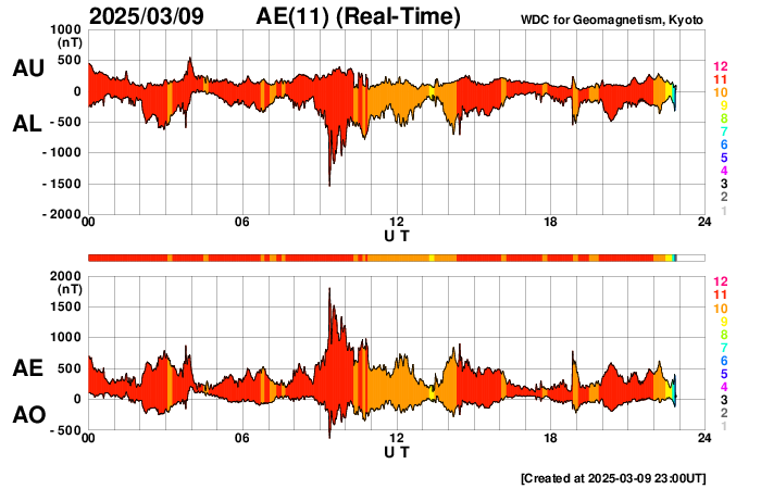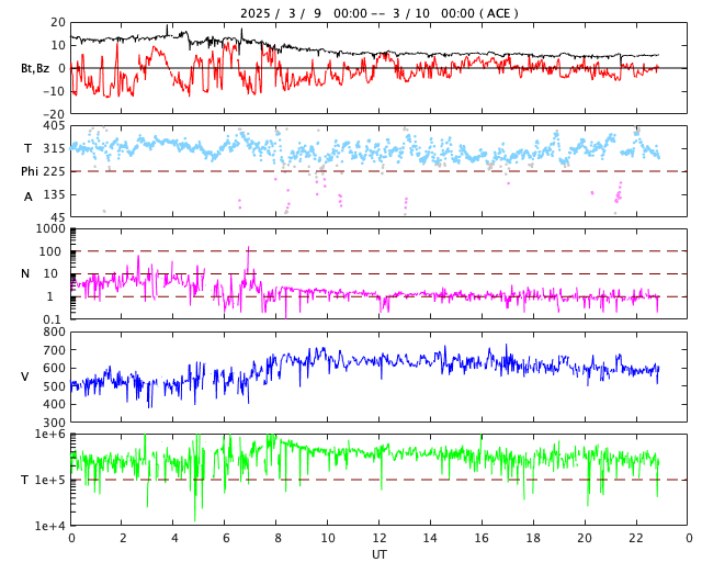 2025/ 3/10 08:03 更新 太陽風の速度は600km/秒台に高まっています。磁気圏も活動的です。 担当 篠原 太陽風の速度は、昨日の夕方に600km/秒台に高まり、 670km/秒程度まで上がった後は少し下がり、 以降は600km/秒前後で推移しています。 高速の状態です。 磁場強度は、13nT程度に強まっていましたが、 速度が600km/秒台に高まった頃から下がり始め、 現在は5nTと平均的な値に戻っています。 太陽風磁場の南北成分は、 グラフの前半は磁場強度が大きかったこともあり、 -10nT程度の強い南向きの変化が発生しています。 磁気圏の活動も強まって、 AE指数は700nT程度の中規模の変化が繰り返し発生し、 最大の変化は1800nTに達しています。 その後、磁場の南北成分は0nT付近で小さく変化する様になっています。 磁気圏の活動は規模が下がり、500nT前後の変化になっています。 SDO衛星AIA193では、 コロナホールは北西(右上)にだいぶ進んでいます。 この領域の影響はいつまで続くでしょうか。 一方、次のコロナホールが太陽の中心部の南側に見えています。 3日後くらいからこの領域の影響が始まりそうです。 27日周期の図で前周期の太陽と比べると、 コロナホールは左側の広がりがなくなって、 規模が小さくなっています。 今回の太陽風速度の高まりは小さくなっているかもしれません。 太陽は、C1~2の小さい小規模フレアが発生した程度で、 穏やかな状態が続いています。 種子島5日目です。 昨日の競技では、残っていたロケット高度部門のチームが優勝しました。 高度計の記録は293m(640ft)でした。 また、CanSatのチームは審査員特別賞のアカデミック賞をいただきました。 最終日の今日は、講演会とワークショップです。 ![]() SDO衛星のAIA193カメラによる太陽コロナの様子 (c) SDO (NASA) ![]() SDO衛星による太陽の可視光写真。マウスの矢印を写真に重ねると、黒点番号付きの写真に切り替わります。 (c) SDO (NASA) ![]() ACEが観測した太陽風の磁場(黒線は全体の強度、赤線は南北成分) 磁場の向き、プラズマの密度、速度、温度 (c) データ:NOAA/SWPC、作図:宇宙天気ニュース ![]() AE指数(速報値) 下段のAEグラフの値が高くなると、オーロラ活動が活発化しています。 (c) 京都大学WDC ![]() 27日の太陽周期に合わせた図 太陽が同じ面を地球に向けていた27日前の変化から、今後を予想することができます。 (c) 作図:宇宙天気ニュース
