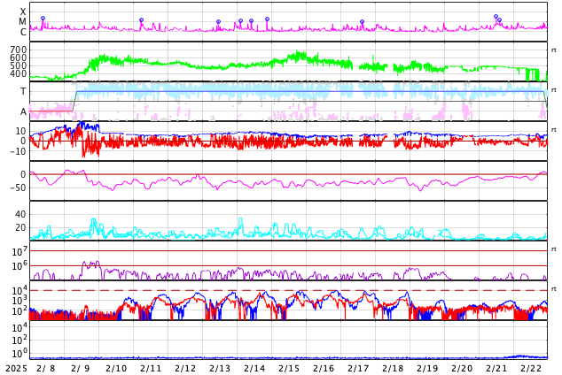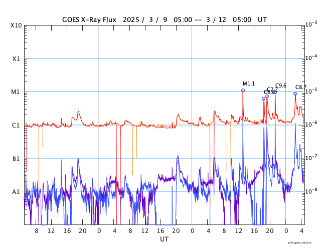 GOES衛星の太陽X線強度。赤・橙 = 0.1〜0.8 nm、青・紫 = 0.05〜0.4 nm (c) データ:NOAA/SWPC、作図:宇宙天気ニュース ![]() | ||||||||||||||||||||||||||||||||||||||||||||||||||||||||||||||||||||||||||||||||||||||||||||||||||||||||||||||||||||||||||||||||||||||||||||||||||||||||||||||||||||||||||||||||||||||||||||||||||||||||||||||||||||||||||||||||||||||||||||||||||||||||||||||
