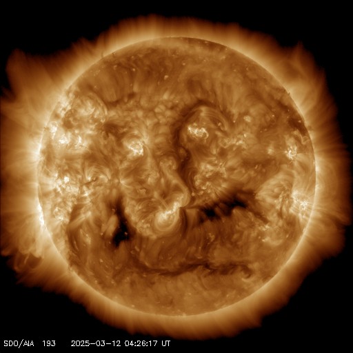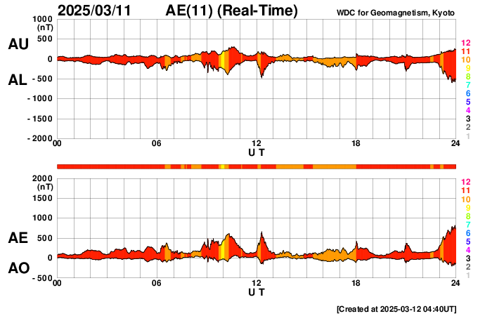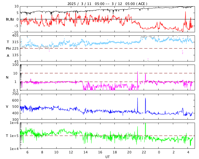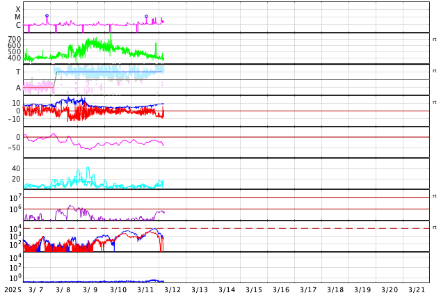 2025/ 3/12 13:55 更新 太陽風は平均的な速度に戻っています。次のコロナホールの影響が始まりそうです。 担当 篠原 太陽風の速度は、昨日のニュース以降も低下が続き、 400km/秒と平均的な速度に戻っています。 一方、磁場強度は昨夜からゆっくり上昇して、 6nTと平均的な状態から、現在は10nTに強まっています。 磁場の南北成分は、 今朝、12日6時(世界時11日21時)頃から南向きが続く様になり、 -7〜 -9nT程度で推移しています。 このため、磁気圏の活動がある程度高まっていて、 AE指数は、500〜700nTの中規模の変化が連続するようになっています。 磁場の南向きの状態はどこまで続くでしょうか。 注目して下さい。 SDO衛星AIA193では、 南半球のコロナホールが南西側(右下)に進んでいます。 この後、この領域の影響で太陽風の速度が高まりそうです。 太陽は、北西(右上)の4024黒点群で、 M1.1の中規模フレア、C5.8、C9.6の小規模フレアが、 南東の端(左下)の向こう側の領域で、 C7.2、C8.8の小規模フレアが発生しています。 南東側は、この後どの様な領域が現れるでしょうか。