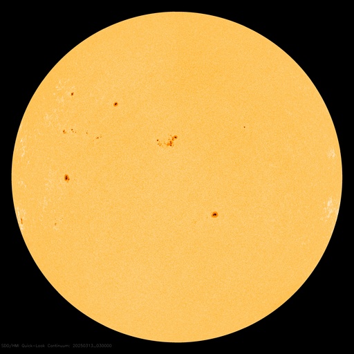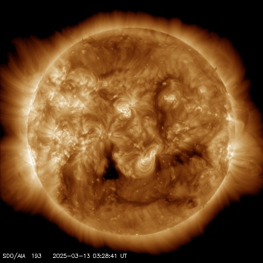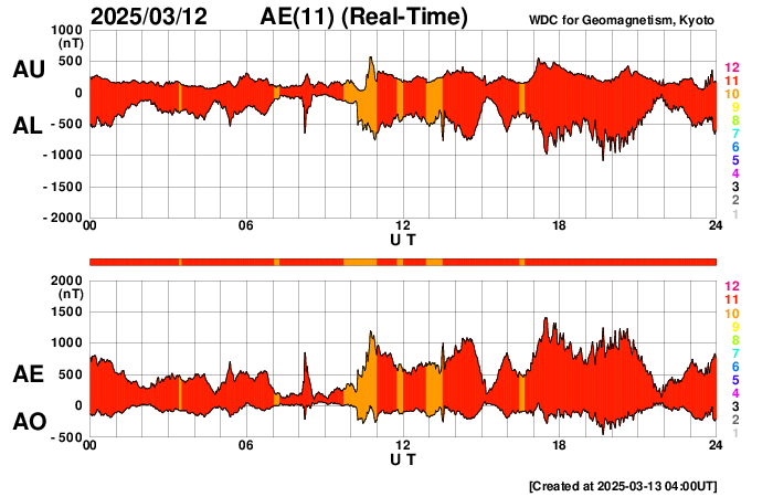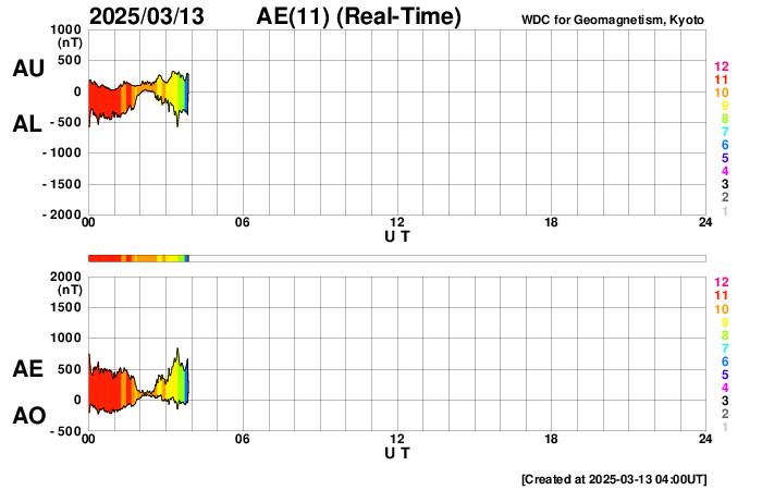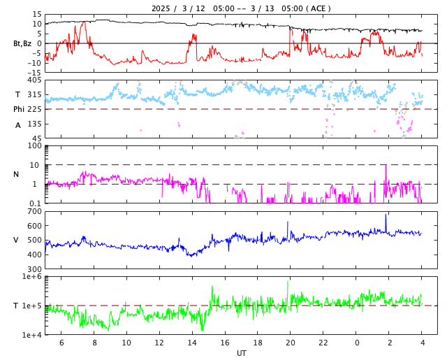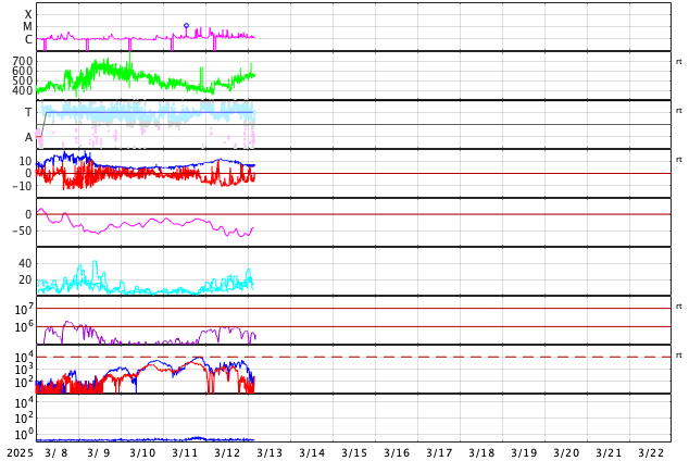 2025/ 3/13 13:15 更新 太陽風の速度が高まっています。太陽風磁場の南向きが続き、磁気圏の活動が強まっています。 担当 篠原 太陽風の速度は、昨日の午後から460km/秒に一段上がり、 今日に入る頃から更に高まって500km/秒と高速の状態になり、 今朝以降は560km/秒に達しています。 磁場強度は、11nTに強まった状態が続きましたが、 今日に入ると次第に下がって、現在は7nTです。 昨日の太陽風のグラフの後半から始まっていた 太陽風磁場の南向きの変化は、現在も続いています。 磁場強度が低下したこともあり、 今日のグラフの前半は -10nTと強まっていましたが、 グラフの最後は -5nT程度の南向きに下がっています。 この太陽風の変化により、磁気圏の活動は活発な状態が続き、 AE指数は、1000〜1400nTの大きい変化が 繰り返し発生しています。 太陽風磁場の南向きの変化はどこまで続くでしょうか。 この後の推移に注目して下さい。 SDO衛星AIA193では、 コロナホールは、南西側(右下)と南東側(左下)に分かれています。 前周期はこの領域が繋がっていたため、 太陽風は高速の状態が続いたのですが、 今回は一旦下がって、再び高まる様な変化になるかもしれません。 太陽は、南東の端の4028黒点群の活動が強まり、 規模はそれほどでもありませんが、 昨日の夕方以降、C5.7、C6.0、C5.8、C4.1や、 C1〜3の小規模フレアが次々に発生しています。 可視光画像では黒点が見えています。 この後も活動は続くでしょうか。