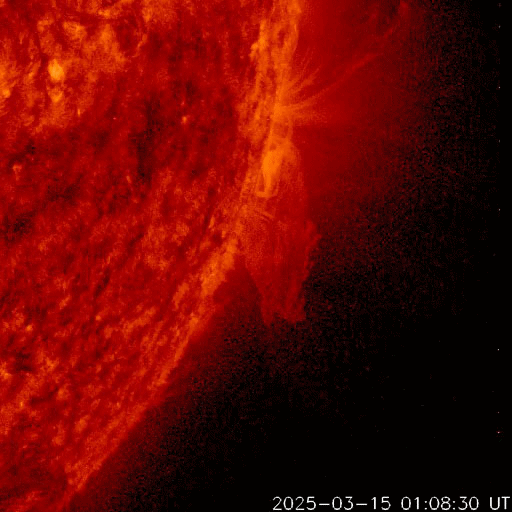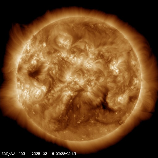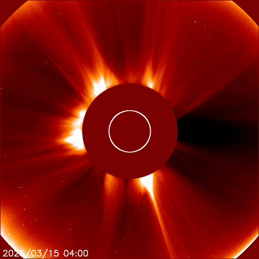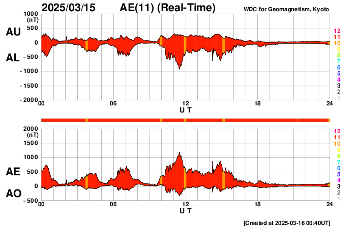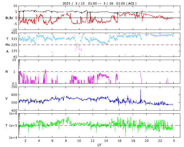 2025/ 3/16 09:51 更新 太陽風の速度は下がり始めています。磁気圏は穏やかになっています。 担当 篠原 太陽風の速度は、今朝早くまでは500km/秒台を保っていましたが、 そこから少し下がって、現在は470km/秒です。 高速の太陽風は一旦終わろうとしている様です。 その一方、SDO衛星AIA193を見ると、 次のコロナホールが太陽の南西側(右下)に進んでいて、 これから、この領域の影響がやって来る可能性があります。 太陽風の速度は引き続き下がって行くのか、再び高まるのか、 推移に注目して下さい。 太陽風の磁場強度は、5nTと平均的な状態です。 磁場の南北成分は、グラフの中盤までは南寄りですが、 その後北寄りに傾向が変わっています。 磁気圏の活動もこれに対応して、 AE指数のグラフは、途中までは500〜1200nTと 中規模、大規模の変化が続いていますが、 後半では変化がなくなって、穏やかになっています。 太陽は、15日13時(世界時15日4時)頃に、 南西の端でプロミネンス噴出が発生しました。 画像を見ると、向こう側で発生した現象の様です。 SDO衛星AIA304の動画を掲載します。 この活動により、X線グラフではC3.9の変化が観測されています。 また、太陽の右下に向かってCME(コロナ質量放出)が発生しています。 SOHO衛星LASCO C2、C3の動画を掲載します。 太陽のこちら側では、 今日未明、26日2時半(世界時25日17時半)に、 北西(右上)の4019黒点群でC4.1の小規模フレアが発生しています。 ![]() 太陽の南西の端で発生したプロミネンス噴出。 (c) SDO衛星AIA304、(動画加工 : 宇宙天気ニュース) ![]() 太陽の右下へ広がるCME。 (c) SOHO衛星LASCO C2、C3 (ESA & NASA)、(動画加工 : 宇宙天気ニュース) ![]() SDO衛星のAIA193カメラによる太陽コロナの様子 (c) SDO (NASA) ![]() SDO衛星による太陽の可視光写真。マウスの矢印を写真に重ねると、黒点番号付きの写真に切り替わります。 (c) SDO (NASA) ![]() ACEが観測した太陽風の磁場(黒線は全体の強度、赤線は南北成分) 磁場の向き、プラズマの密度、速度、温度 (c) データ:NOAA/SWPC、作図:宇宙天気ニュース ![]() AE指数(速報値) 下段のAEグラフの値が高くなると、オーロラ活動が活発化しています。 (c) 京都大学WDC ![]() ![]() 27日の太陽周期に合わせた図 太陽が同じ面を地球に向けていた27日前の変化から、今後を予想することができます。 (c) 作図:宇宙天気ニュース