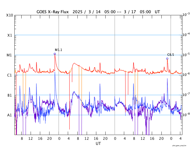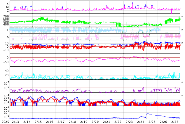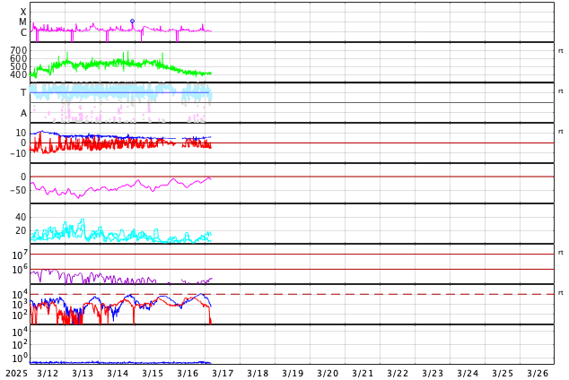 GOES衛星の太陽X線強度。赤・橙 = 0.1〜0.8 nm、青・紫 = 0.05〜0.4 nm (c) データ:NOAA/SWPC、作図:宇宙天気ニュース ![]() | ||||||||||||||||||||||||||||||||||||||||||||||||||||||||||||||||||||||||||||||||||||||||||||||||||||||||||||||||||||||||||||||||||||||||||||||||||||||||||||||||||||||||||||||||||||||||||||||||||||||||||||||||||||||||||||||||||||||||||||||||||||||||||||||||||||||||||||