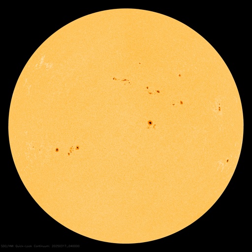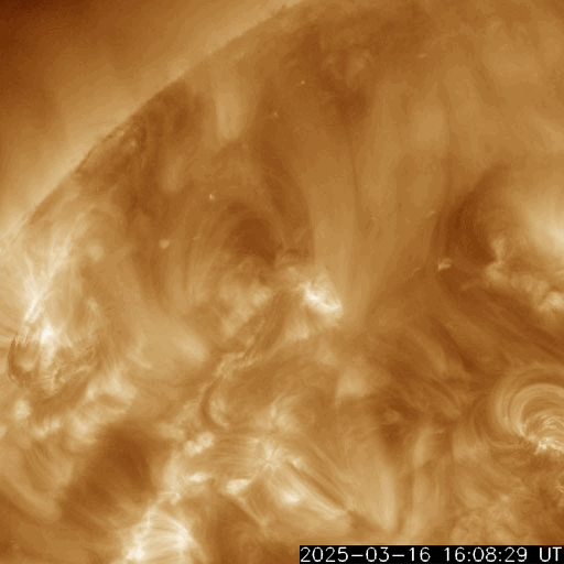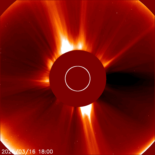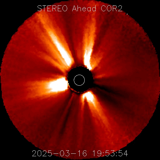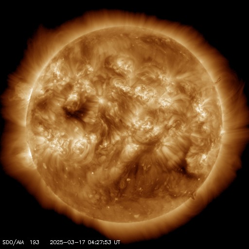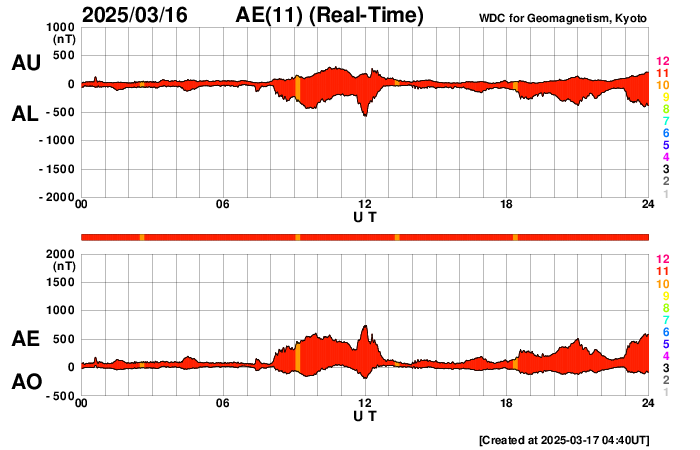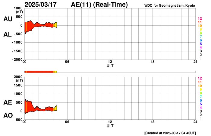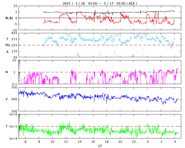 2025/ 3/17 13:46 更新 太陽風は平均的な速度に戻っています。磁気圏はやや活動的です。 担当 篠原 太陽風の速度は、450km/秒から400km/秒へ下がり、 平均的な速度に戻っています。 磁場強度は、5nTで安定しています。 太陽風磁場の南北成分は、南北両方に変化が発生しています。 磁気圏の活動はある程度高まっていて、 AE指数は、500nTの中規模の変化が数回発生しています。 SDO衛星AIA193では、 南半球のコロナホールは南西側(右下)に進んで、 やや見にくくなっています。 この領域の影響はこれからやって来るでしょうか。 SOHO衛星LASCO C2、C3で、 今朝、17日6時(世界時16日21時)頃に、 太陽の上側に向かってCME(コロナ質量放出)が広がっています。 太陽を地球よりも右側から観測している STEREO Ahead衛星のCOR2では、 このCMEは太陽の左上に飛び出しています。 このため、太陽のこちら側で発生した現象の様です。 SDO衛星AIA195を見ると、 北東側(左上)で小規模の噴出が発生している様です。 この活動がCMEに繋がっているのかもしれません。 このCMEの影響として、 3日後くらいに太陽風磁場の強まりがやって来るかもしれません。 太陽の可視光写真は、黒点群が12群と多く見えていますが、 フレアの発生は比較的穏やかで、 北西(右上)の4019黒点群でC4.2、 南東(左下)の4028群でC6.5などの 小規模フレアが発生した程度です。