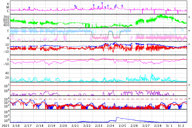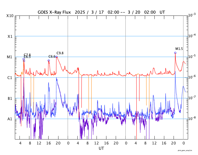 GOES衛星の太陽X線強度。赤・橙 = 0.1〜0.8 nm、青・紫 = 0.05〜0.4 nm (c) データ:NOAA/SWPC、作図:宇宙天気ニュース ![]() | ||||||||||||||||||||||||||||||||||||||||||||||||||||||||||||||||||||||||||||||||||||||||||||||||||||||||||||||||||||||||||||||||||||||||||||||||||||||||||||||||||||||||||||||||||||||||||||||||||||||||||||||||||||||||||||||||||||||||||||||||||||||||||||||||||