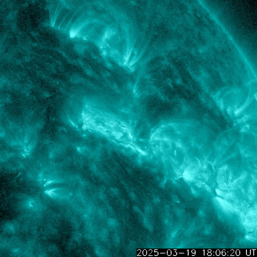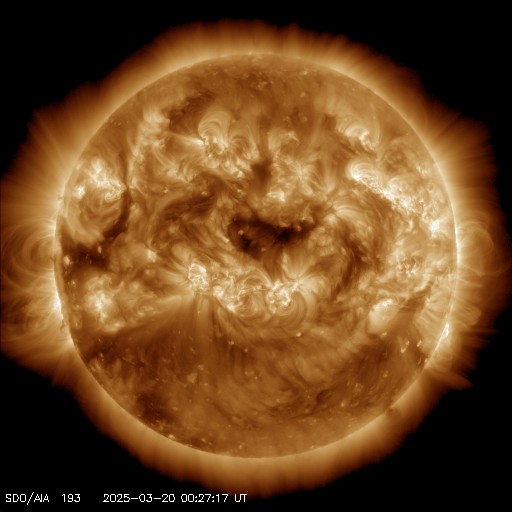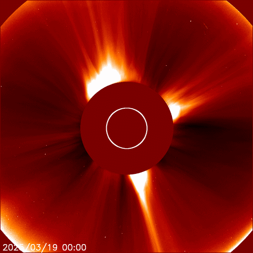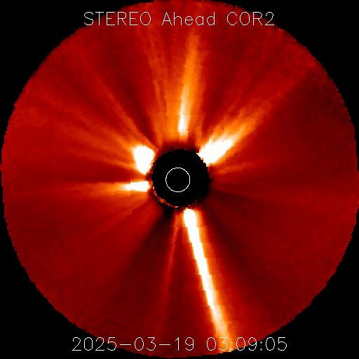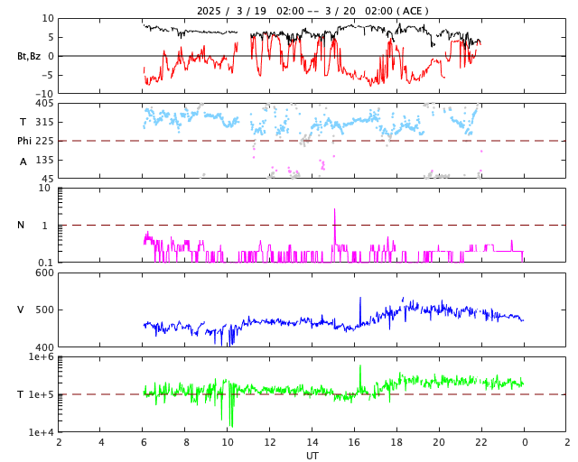2025/ 3/20 10:07 更新 太陽風の速度は少し高まっています。CMEが発生しています。 担当 篠原 太陽風の速度は、昨日のニュースの後に450km/秒へ少し上がり、 今日未明に一時的に500km/秒まで高まっています。 現在は少し下がって480km/秒とやや高速の状態です。 磁場強度は、6〜7nTで推移していましたが、 グラフの最後は3nTとやや弱くなっています。 磁場の南北成分は、 -5nTを超えるくらいの南向きの変化が発生していて、 磁気圏の活動が強まり、 AE指数では800nTや1000nTを少し超えるような 中、大規模の変化が発生しています。 太陽風のグラフの最後で磁場強度が下がっているので、 この後は、磁場が南を向いても変化は小さくなりそうです。 太陽では、昨日の朝、19日9時(世界時19日0時)頃に、 中心部北側(上側)でフィラメント噴出が発生しています。 SDO衛星AIA304の動画を掲載します。 コロナのガスが上側に飛び出す様子が見えています。 この噴出に対応すると思うのですが、 SOHO衛星LASCO C2、C3で、太陽の左上に向かう CME(コロナ質量放出)が観測されています。 また、太陽を地球よりも右側から観測している STEREO Ahead衛星のCOR2でも、 CMEが太陽の左上に大きく広がっています。 発生場所が太陽の中心に近いので、 太陽風磁場の強まりなどが地球に到来するかもしれません。 この時、磁場が南向きに強まると、 磁気圏の活動が強まる可能性があります。 到来は22〜23日くらいでしょうか。 また、今朝、20日5時半(世界時19日20時半)に、 北西(右上)の4031黒点群でM1.5の中規模フレアが発生しました。 SDO衛星AIA131の動画を掲載します。 ![]() 太陽の中心部北側で発生したフィラメント噴出。 (c) SDO衛星AIA304、(動画加工 : 宇宙天気ニュース) ![]() 太陽の左上へ広がるCME。 (c) SOHO衛星LASCO C2、C3 (ESA & NASA)、(動画加工 : 宇宙天気ニュース) ![]() 太陽を地球よりも右側から観測しているSTEREO Ahead衛星によるCMEの様子。 (c) STEREO Ahead衛星COR2 (NASA)、(動画加工 : 宇宙天気ニュース) ![]() 4031黒点群で発生した、M1.5の中規模フレア。 (c) SDO衛星AIA131 (NASA)、(動画加工 : 宇宙天気ニュース) ![]() SDO衛星のAIA193カメラによる太陽コロナの様子 (c) SDO (NASA) ![]() SDO衛星による太陽の可視光写真。マウスの矢印を写真に重ねると、黒点番号付きの写真に切り替わります。 (c) SDO (NASA) ![]() ACEが観測した太陽風の磁場(黒線は全体の強度、赤線は南北成分) 磁場の向き、プラズマの密度、速度、温度 (c) データ:NOAA/SWPC、作図:宇宙天気ニュース ![]() AE指数(速報値) 下段のAEグラフの値が高くなると、オーロラ活動が活発化しています。 (c) 京都大学WDC ![]() ![]() 27日の太陽周期に合わせた図 太陽が同じ面を地球に向けていた27日前の変化から、今後を予想することができます。 (c) 作図:宇宙天気ニュース