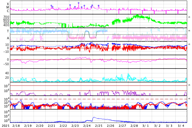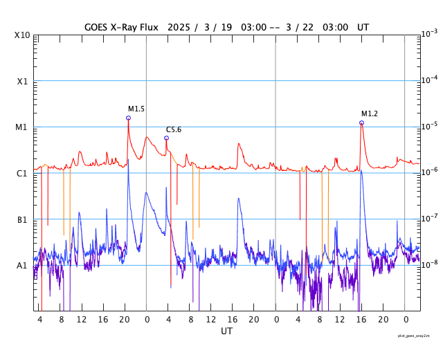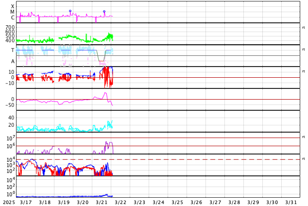 GOES衛星の太陽X線強度。赤・橙 = 0.1〜0.8 nm、青・紫 = 0.05〜0.4 nm (c) データ:NOAA/SWPC、作図:宇宙天気ニュース ![]() | ||||||||||||||||||||||||||||||||||||||||||||||||||||||||||||||||||||||||||||||||||||||||||||||||||||||||||||||||||||||||||||||||||||||||||||||||||||||||||||||||||||||||||||||||||||||||||||||||||||||||||||||||||||||||||||||||||||||||||||||||||||||||||||||||||||||||||||