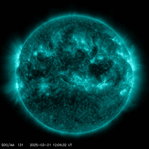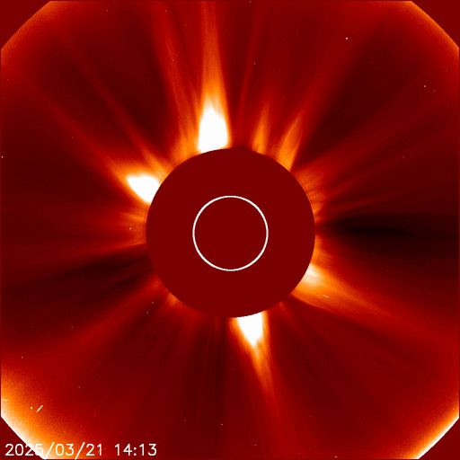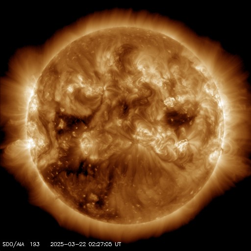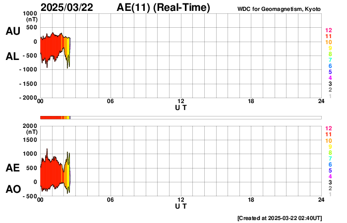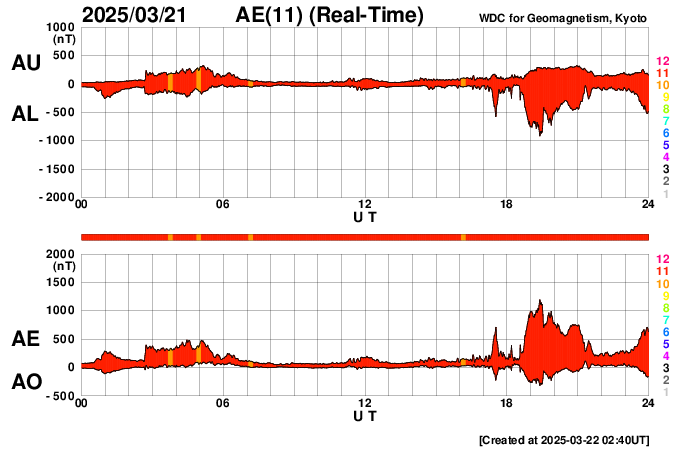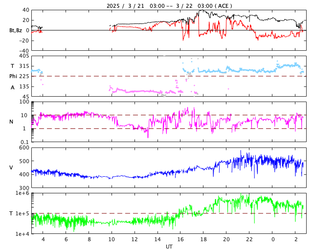 2025/ 3/22 11:53 更新 太陽風の速度と磁場が高まる変化が到来しています。磁気圏も活動的になっています。 担当 篠原 昨夜、21日21時(世界時20日12時)頃から太陽風の速度が高まり始め、 380km/秒とやや低速の状態から、 今朝、22日5時(世界時21日20時)には500km/秒と 高速の風に変わっています。 SDO衛星AIA193の北西側(右上)に見えていた コロナホールの影響がやって来た可能性があります。 コロナホールの広がりは比較的小さかったのですが、 太陽風の速度はしっかりと高まっています。 速度と共に太陽風の磁場強度が強まっています。 昨夜にかけて5nTと平均的な状態から 20nTへ強まる変化が見られたのですが、 22日3時(世界時21日18時)には、 40nTとかなり大きい変化が発生しています。 その後はゆっくりと20nTに下がり、 グラフの最後で7nTと平均的な状態に戻りかけています。 この磁場の強まりは、17日のニュースでお知らせした CME(コロナ質量放出)の変化が関係しているのかもしれません。 太陽風磁場の南北成分は、 今朝までは北寄りの傾向で、 グラフの最後に-10nT程度の南向きの変化が発生しています。 このため、AE指数はグラフの途中までは変化の少ない状態が続き、 後半から1000nTに達する大きい変化が見られる様になっています。 太陽風の磁場強度は下がってきましたが、 速度は高まっているので、引き続き変化に注目してください。 SDO衛星AIA193では、 南東側(左下)にコロナホールの大きい広がりが見えています。 4〜5日後くらいからこちらの影響に注目して下さい。 SOHO衛星LASCO C2、C3によると、 22日1時(世界時21日16時)頃に、 太陽の左下寄りにかなり淡いCMEが広がっています。 STEREO Ahead衛星の画像が更新されていないので、 太陽のこちら側の現象か向こう側の現象かはっきりしません。 SDO衛星AIA131、193を見ると、 22日0時半(世界時21日15時半)に南西(右下)の4028黒点群で M1.2の中規模フレアが発生し、 ほぼ同じ頃に中心部でも爆発現象が発生しています。 これらの変化がCMEに関係している可能性がありますが、 CMEの広がり方やタイミングがやや合わない様にも感じます。 太陽のこちら側の現象であれば、 2〜3日後くらいに太陽風の強まりがやって来るかもしれません。 コロナホールの変化と重なって、複雑な推移になるかもしれません。